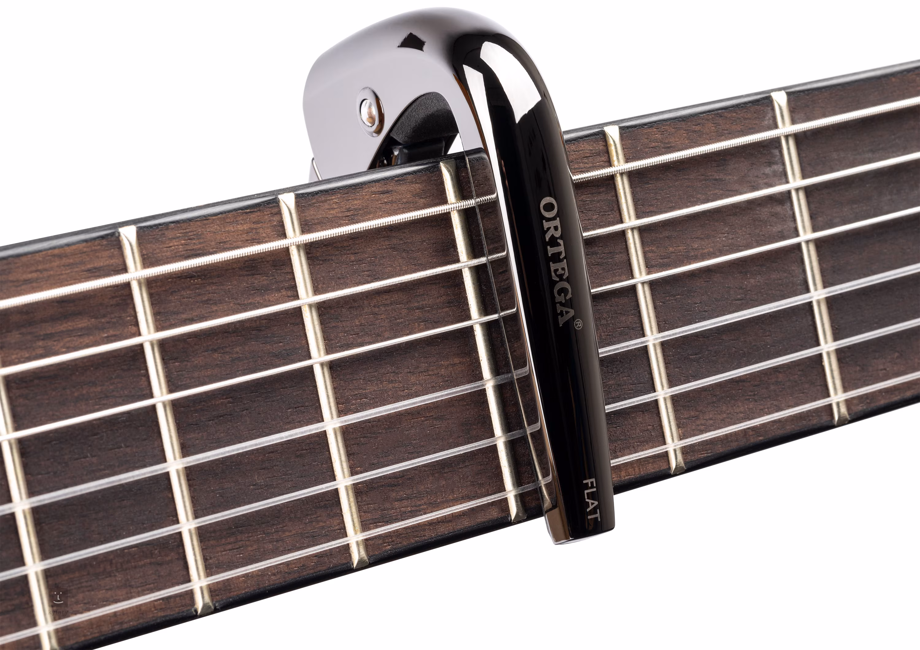 Nová řada kapodastrů od firmy Ortega je vyrobená ze speciální slitiny hliníku, která jim poskytuje extrémní odolnost a zároveň nízkou hmotnost. Kapodastr je díky systému Quick-Lock velice jednoduchý na používání a poskytuje vyrovnaný tlak na struny. Upevnit ho tak můžete prakticky během vteřiny a máte jistotu, že váš nástroj bude stále perfektně ladit. Tento model je vhodný zejména pro klasické kytary, avšak je možné ho využít prakticky s jakýmkoliv nástrojem s plochým hmatníkem do šířky 52 mm. Kapodastr je dodáván společně s ochranným bavlněným pytlíkem.
