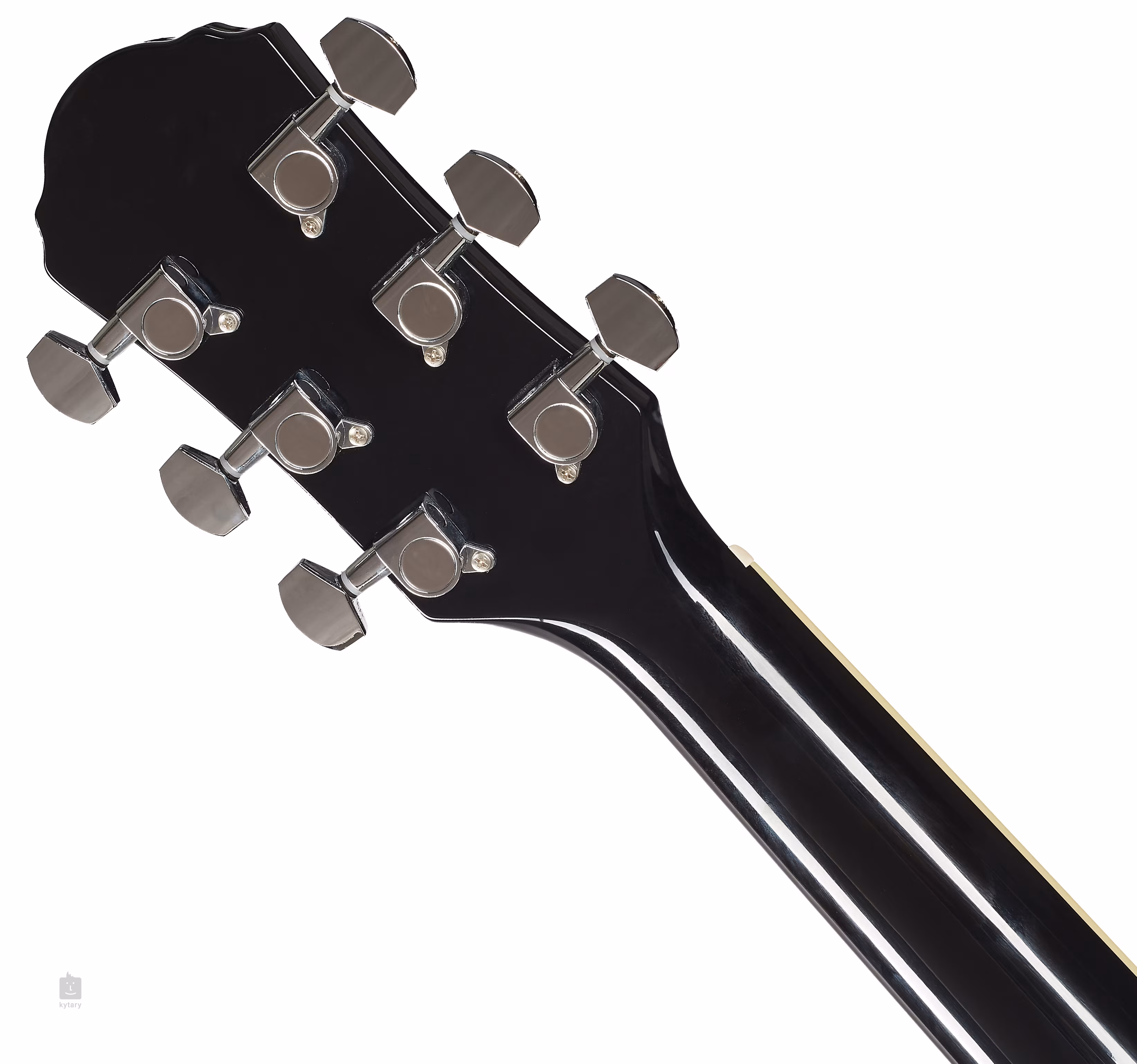 Struny jsou uchyceny v chromovaných litých (Die-Cast) mechanikách. Pěkné zpracování podtrhuje obvodová lemovka doplněná výložkou z imitace perleti, rozeta složená z prstenců z imitace perleti a černobílých linek a praktický pickguard z imitace želvoviny.
