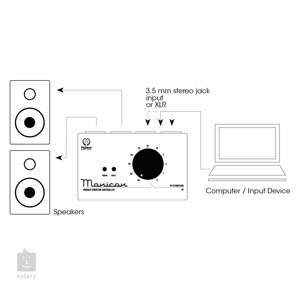 S Palmer Monicon máte hlasitost monitorů vždy pod kontrolou . Pasivní mini-mixer s možností připojení stereo výstupu notebooku, PC nebo audio rozhraní, umožňuje pohodlné a přesné ovládání hlasitosti monitorů z pracovního stolu. Pasivní obvody nemají absolutně žádný vliv na zvuk. Mute a mono tlačítka umožňují vypnout výstupy a sloučit stereo výstupní signál na mono hlavní signál. Zadní panel nabízí pár kombi XLR/Jack vstupů, stereo Aux in a dvojici XLR výstupů.