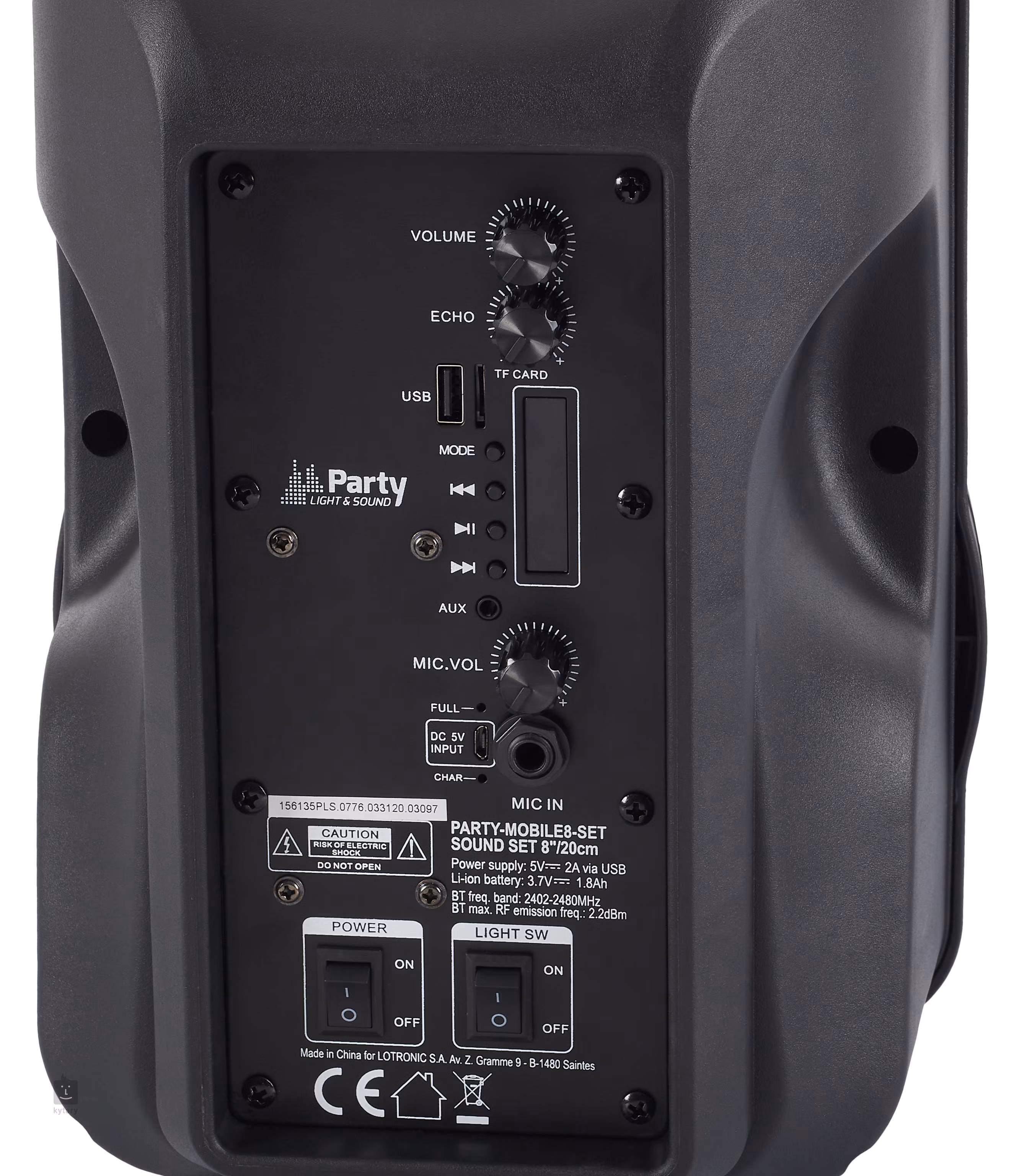 Sada vhodná pro ozvučení komornějšího live performance, zkušebny, konference, narozeninové oslavy, či garden párty. Set disponuje aktivním reproduktorem se vstupem pro mikrofon integrovaným echo efektem, provozem na baterie, dobrým zvukem, LED světelným efektem a samozřejmě bezdrátovou technologií Bluetooth. Hudbu můžete streamovat i prostřednictvím klasického linkového vstupu, USB portu, nebo slotu pro TF paměťovou kartu. Mobile 8 Set dále obsahuje mikrofon s kabelem, reproduktorový stojan a dálkový ovladač. S tímto reproduktorem zazáříte v parku, na oslavě, nebo u táboráku, když už kytarista odpadl a nikdo jiný hrát na kytaru neumí.