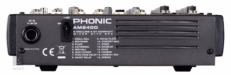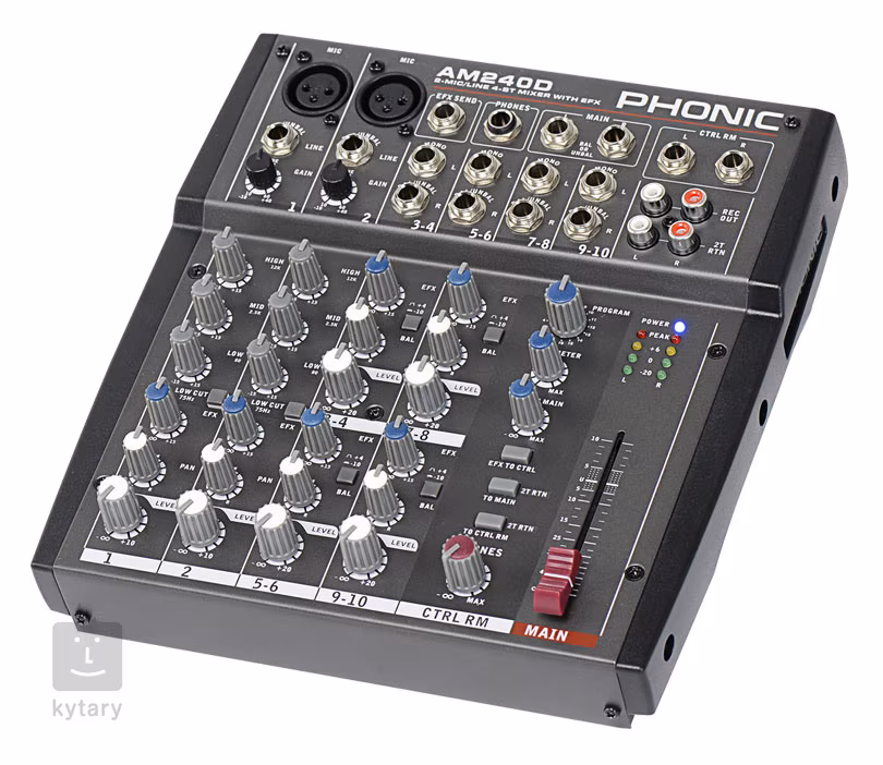 Phonic AM 240D je kompaktní mixážní pult s dvěma mono mikrofonními/linkovými vstupy a čtyřmi stereo kanály. Jeho funkcionalitu rozšiřuje zabudovaná efektová jednotka a efektová cesta přiřaditelná na hlavní výstup nebo monitoring. Mono kanály mají třípásmové korekce a potěší také zabudovaný LED metr pro vizuální kontrolu úrovně výstupu.