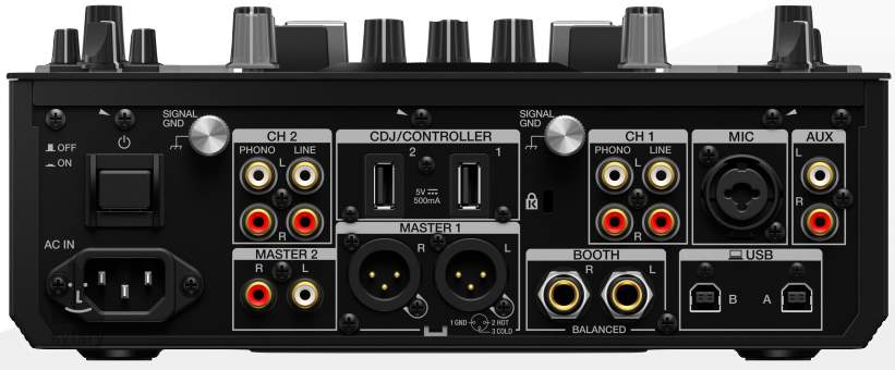 Kombi XLR/Jack, 4x Line RCA, 4x Phono RCA, 2x AUX RCA