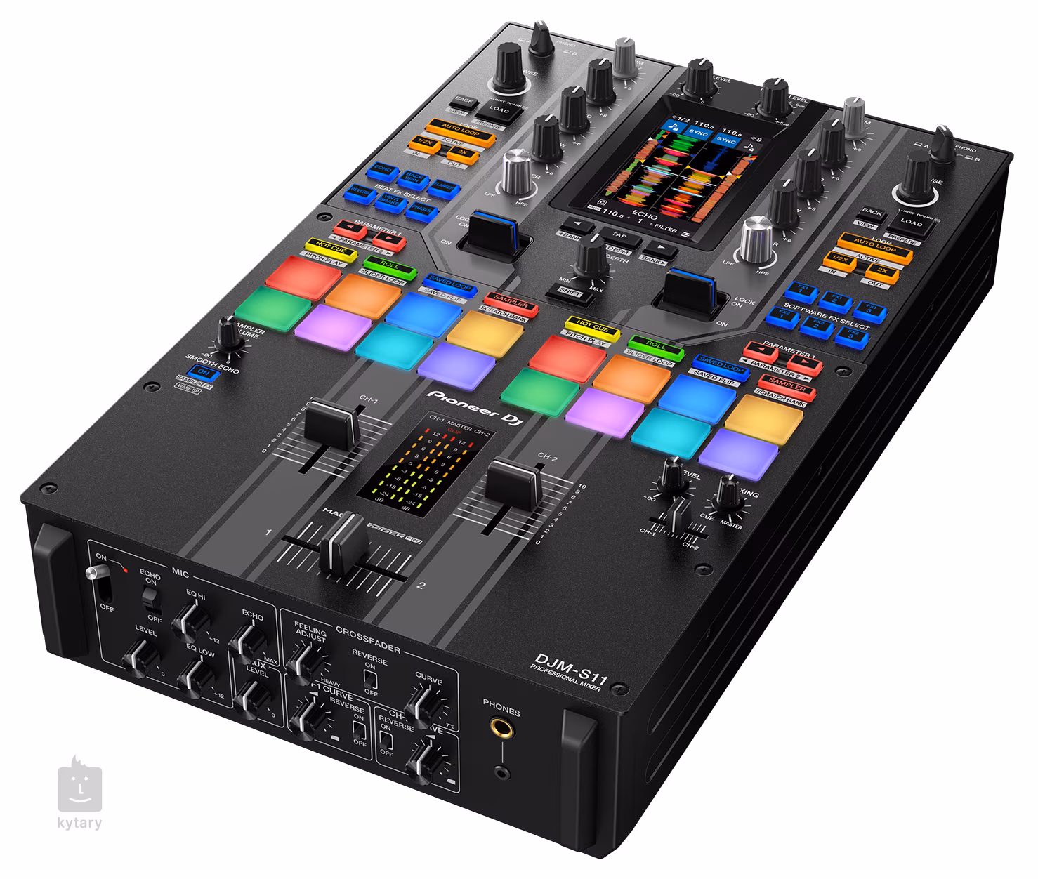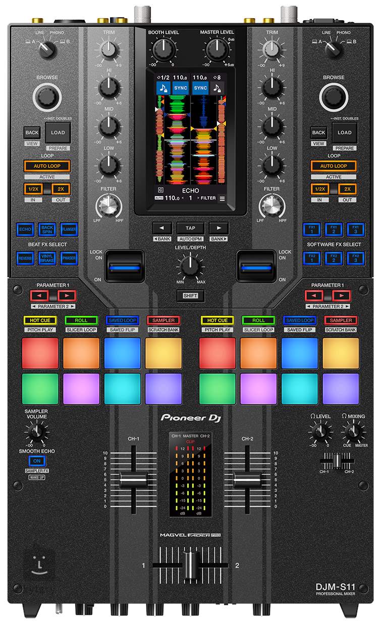 !!!Limitovaná edice DJM-S11 obsahující pruhy!!! DJM-S11-SE je horkou novinkou od Pioneer DJ a je připraven pozvednou vaší kariéru DJ na další level. Jedná se o výkonný profesionální dvoukanálový mixpult vhodný na live performance i studiová session a zároveň vám zprostředkuje velmi dynamické DJ battle v mixu nebo scratchování. K dispozici budete mít šestnáct RGB podsvícených ultra citlivých Padů, dva volume fadery a MAGVEL FADER PRO s posílenou stabilitou pro scratching a intuitivní ovládací panel s 4,3“ dotykovým displejem. DJM-S11-SE je prvním DJ mixpultem na světě, který umožňuje připojení až čtyř DJ zařízení pro jednodušší tvoření live mashupů. Také budete mít k dispozici až 22 integrovaných efektů s možností uložení až do čtyřech FX bank. Novinkou je také Smootch Echo, které můžete aktivovat pouhým spuštěním daného tlačítka, PADu nebo faderu. Mixpult je také plně kompatibilní se Serato DJ PRO a rekrodbox, jejichž licence jsou součástí balení. Přední strana DJM-S11-SE disponuje ovládacím panelem pro vstupní a výstupní signál, naleznete zde ovladače hlasitosti pro mikrofonní vstup, dva kanály, spínač Echo či Reverse efektu, dvoupásmový ekvalizér a duální sluchátkový výstup pro detailní monitoring. Zadní panel potom nabízí flexibilní konektivitu v podobě stereo RCA In/Out, kombinovaného vstupu pro mikrofon, XLR a linkového výstupu do PA, dvou USB-B výstupů do PC či laptopu a dvou USB-A vstupů pro DJ kontroléry.