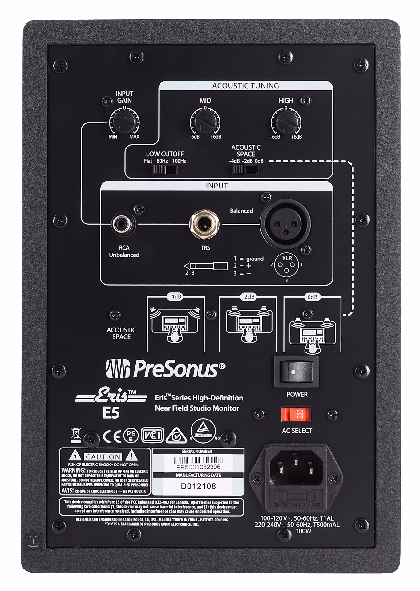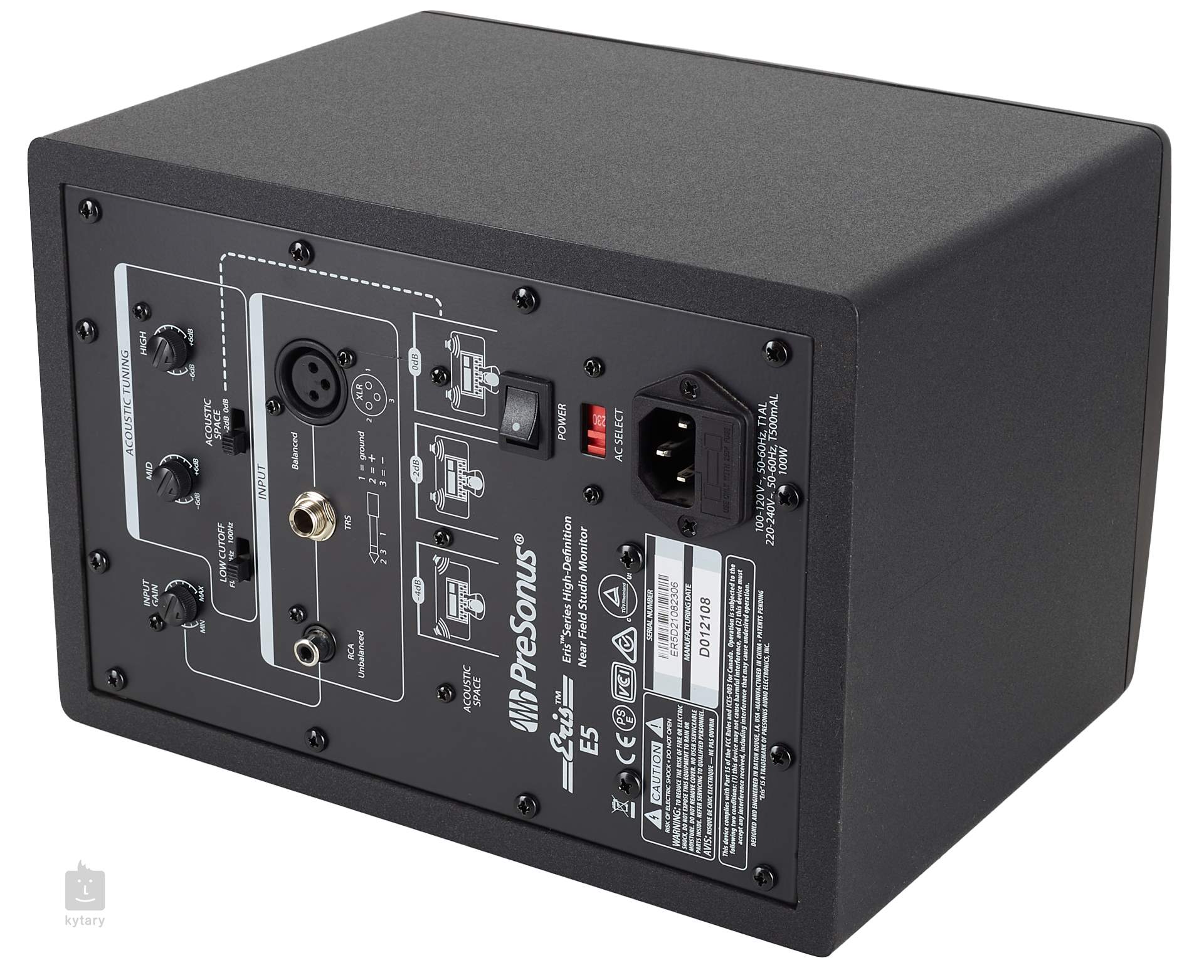 Eris E5 nabízí samostatné symetrické vstupní konektory XLR a jack 6,3 TRS a kromě toho také nesymetrické RCA (cinch) vstupy. Monitor je stíněný proti rádiovému vysílání (RF), má tepelnou ochranu, omezení proudu na výstupu i podzvukovou ochranu.