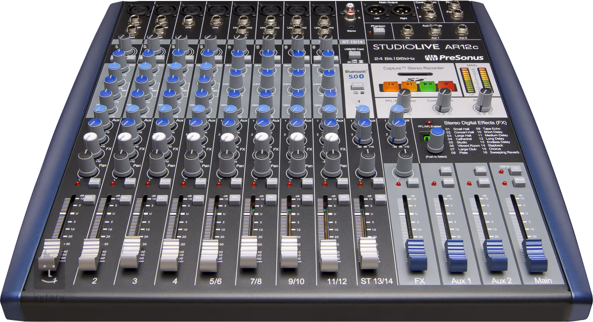 Presonus StudioLive® AR12c je analogový mixážní pult s vestavěným multikanálovým USB audio rozhraním 14 in / 4 out, efektovou jednotkou a DAW Studio One Artist.