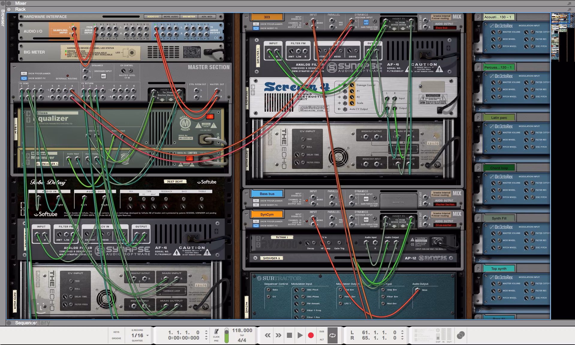 Virtuální racková jednotka v kombinaci se samostatným MIDI sequencerem. Manipulace s jednotlivými editory je pak naprosto stejná, jako v reálném studiovém prostředí.