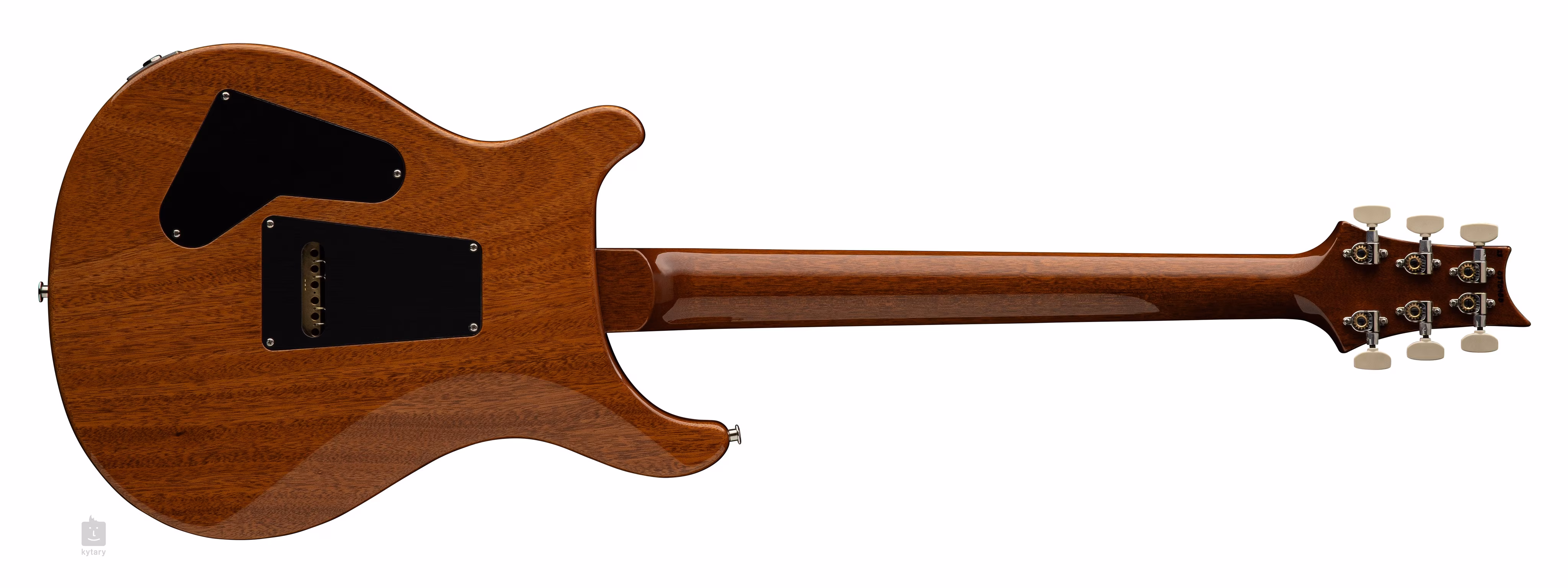 Model Custom 24-08 Black Top (Natural Back) už na první pohled upoutá kombinací lesklého černého javorového topu a mahagonového těla. Ke krku z jednoho kusu mahagonu s profilem Pattern Thin je přilepen palisandrový hmatník osazený čtyřiadvaceti pražci. Orientaci na hmatníku usnadňují trademark PRS polohové značky v podobě perleťových ptačích siluet.