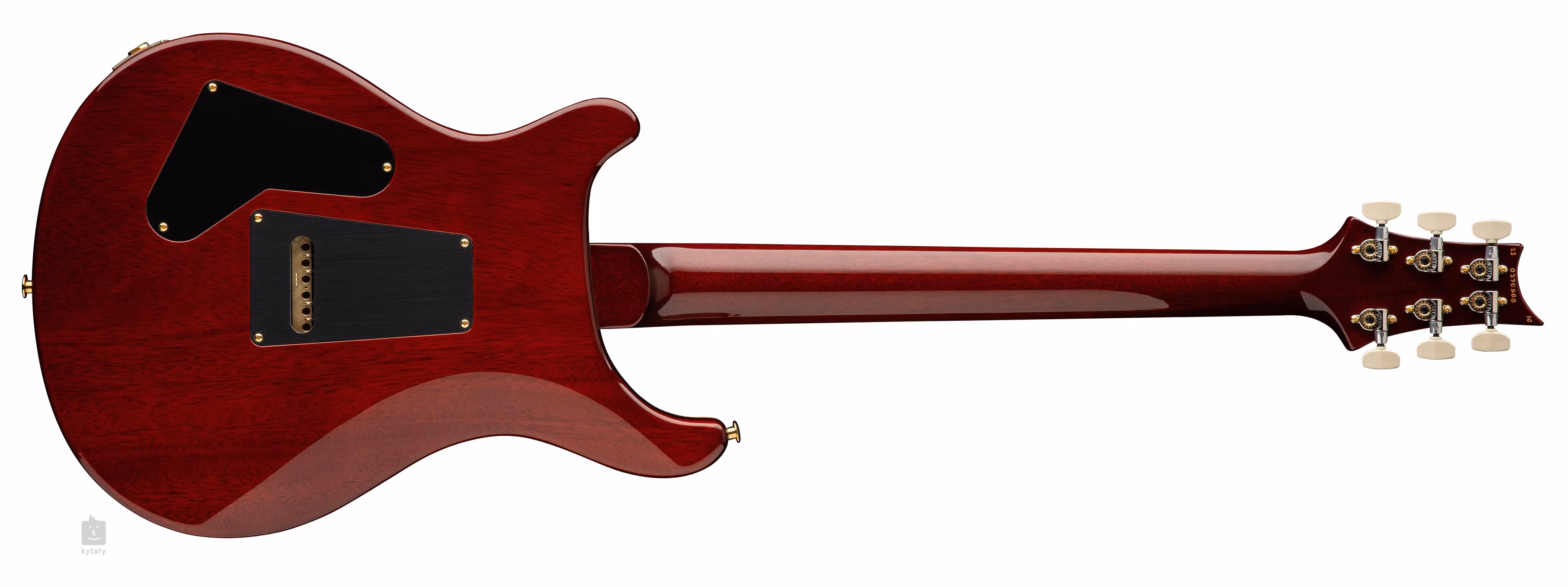 Model Custom 24-08 Dark Cherry Sunburst už na první pohled upoutá kombinací ergonomicky tvarovaného mahagonového těla s typickým dvojitým PRS výřezem a topu z figurovaného javoru s parádní kresbou dřeva. Ke krku z jednoho kusu mahagonu s profilem Pattern Thin je přilepen palisandrový hmatník osazený čtyřiadvaceti pražci. Orientaci na hmatníku usnadňují trademark PRS polohové značky v podobě perleťových ptačích siluet.