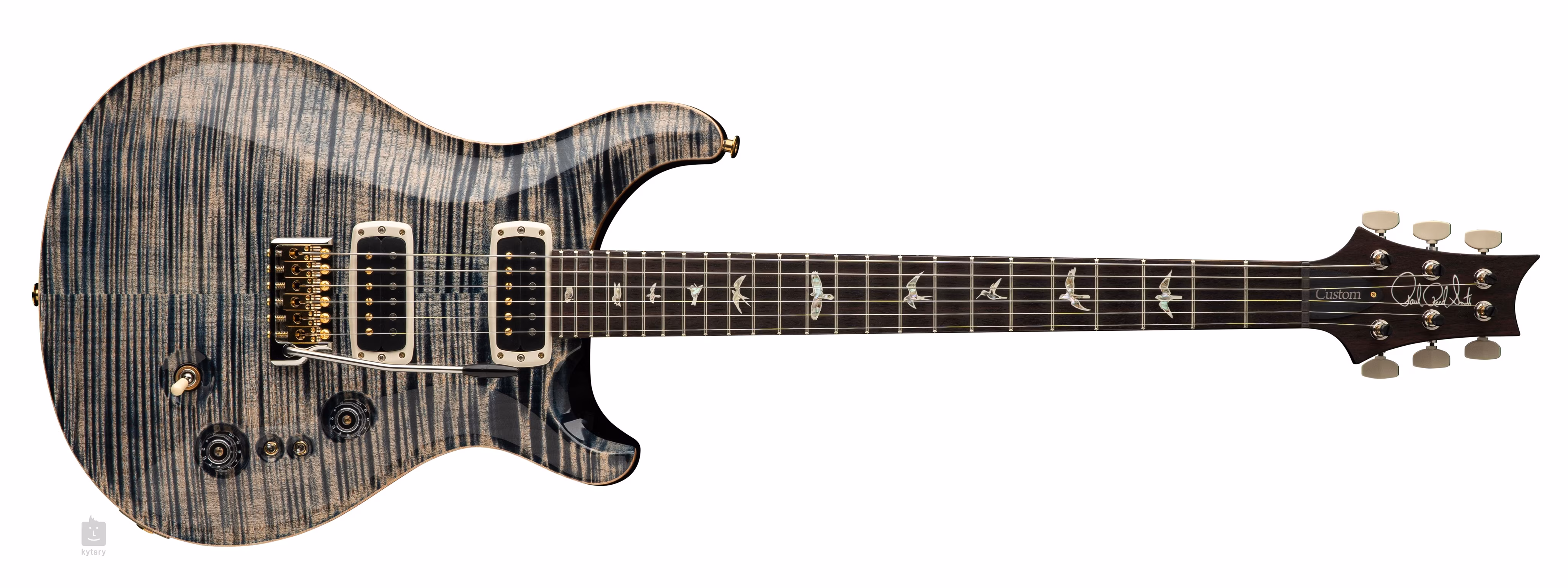 Model Custom 24-08 Faded Whale Blue už na první pohled upoutá kombinací ergonomicky tvarovaného mahagonového těla s typickým dvojitým PRS výřezem a topu z figurovaného javoru s parádní kresbou dřeva. Ke krku z jednoho kusu mahagonu s profilem Pattern Thin je přilepen palisandrový hmatník osazený čtyřiadvaceti pražci. Orientaci na hmatníku usnadňují trademark PRS polohové značky v podobě perleťových ptačích siluet.