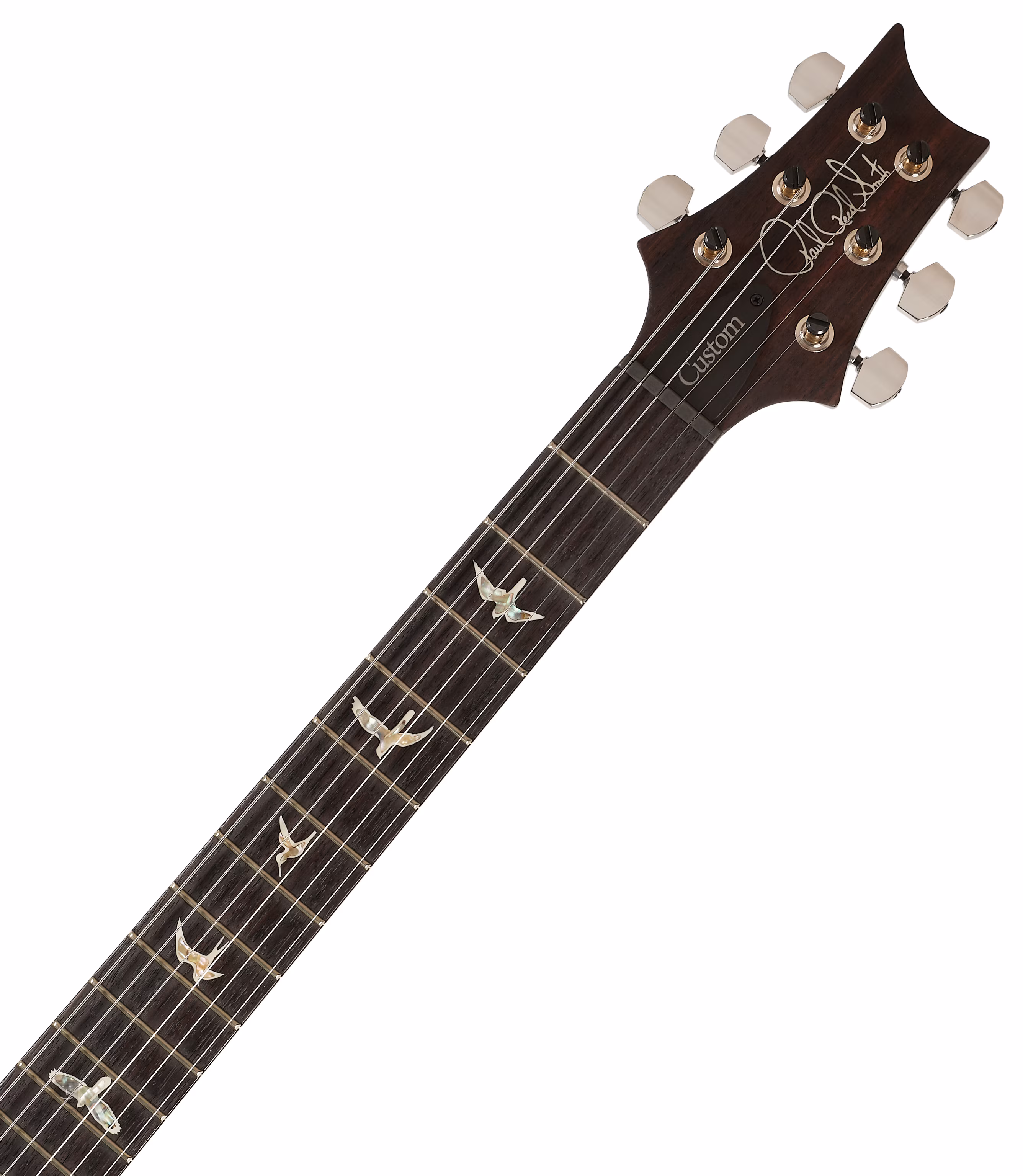 Model Custom 24 nabízí spojení masivního ergonomicky tvarovaného mahagonového těla s typickým dvojitým PRS výřezem a javorového topu. K mahagonovému krku s profilem Pattern Thin je přilepen palisandrový hmatník ozdobený typickými polohovými značkami v podobě ptačích siluet.