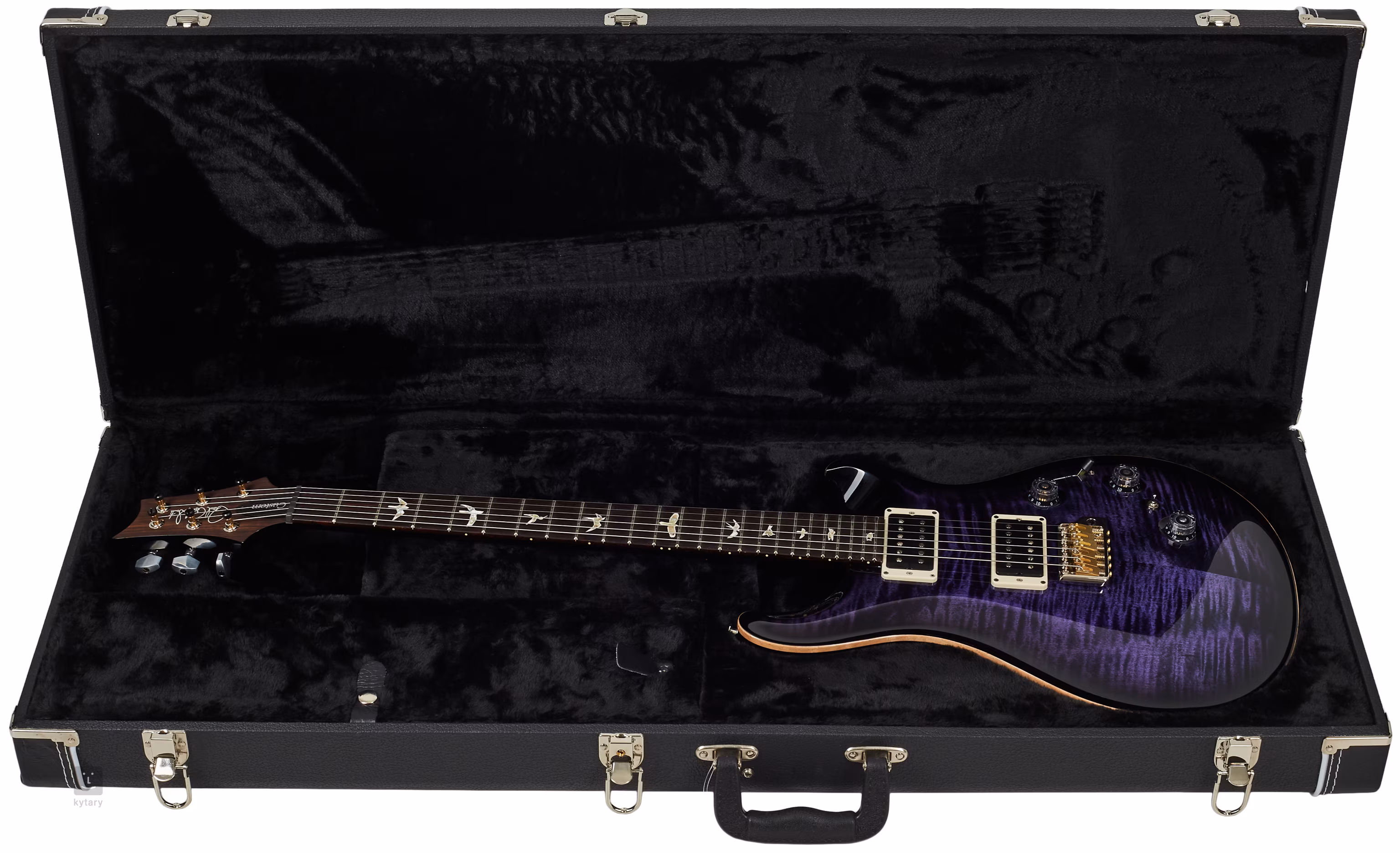 Model Custom 24 Piezo Purple Mist nabízí spojení javorového topu a ergonomicky tvarovaného mahagonového těla s typickým dvojitým PRS výřezem. K mahagonovému krku s profilem Pattern Thin je přilepen palisandrový hmatník osazený luxusními perleťovými polohovými značkami v podobě ptačích siluet.