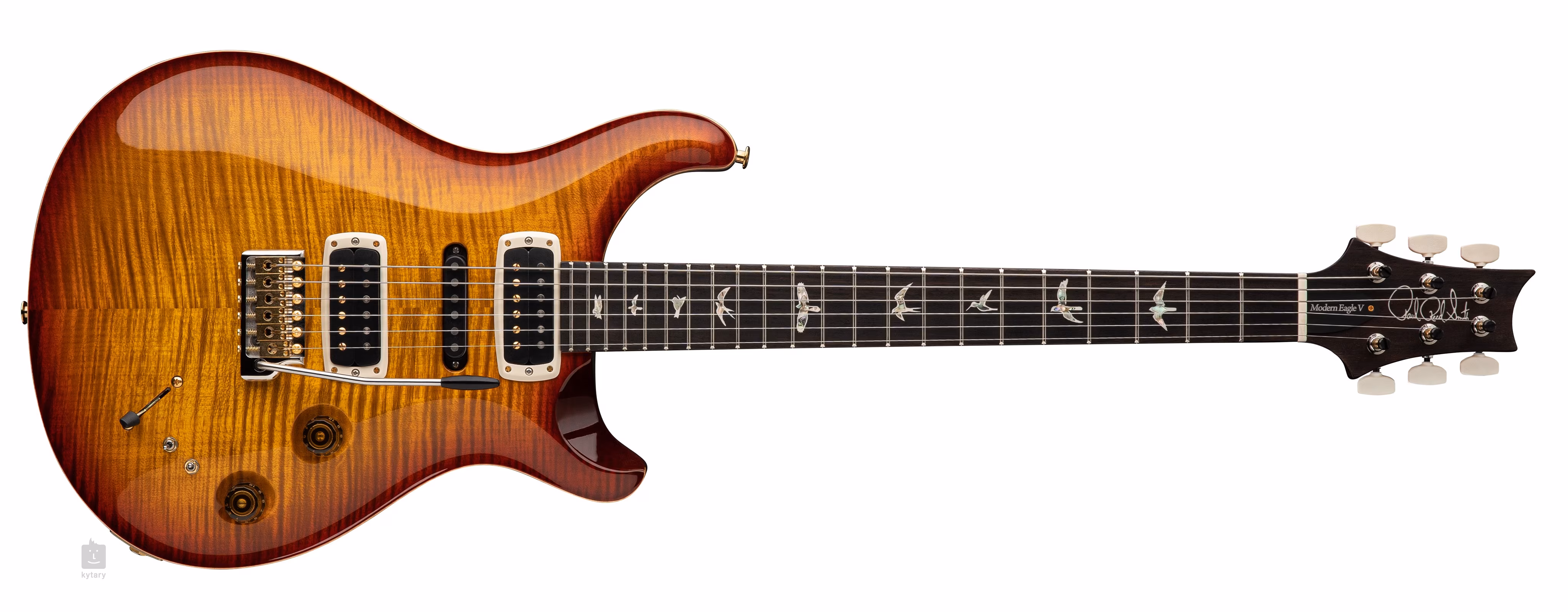 PRS Modern Eagle V je moderní elektrická kytara v PRS double-cut designu s H-S-H konfigurací snímačů, kterou oceníte ve studiu i na stage. Ergonomicky tvarované mahagonové tělo modelu Modern Eagle V Dark Cherry Sunburst zdobí top z figurovaného javoru a lesklý nitrolak. Ke krku z jednoho kusu mahagonu s profilem Pattern je přilepen palisandrový hmatník osazený dvaadvaceti pražci. Orientaci na hmatníku usnadňují trademark PRS polohové značky v podobě luxusních perleťových ptačích siluet.
