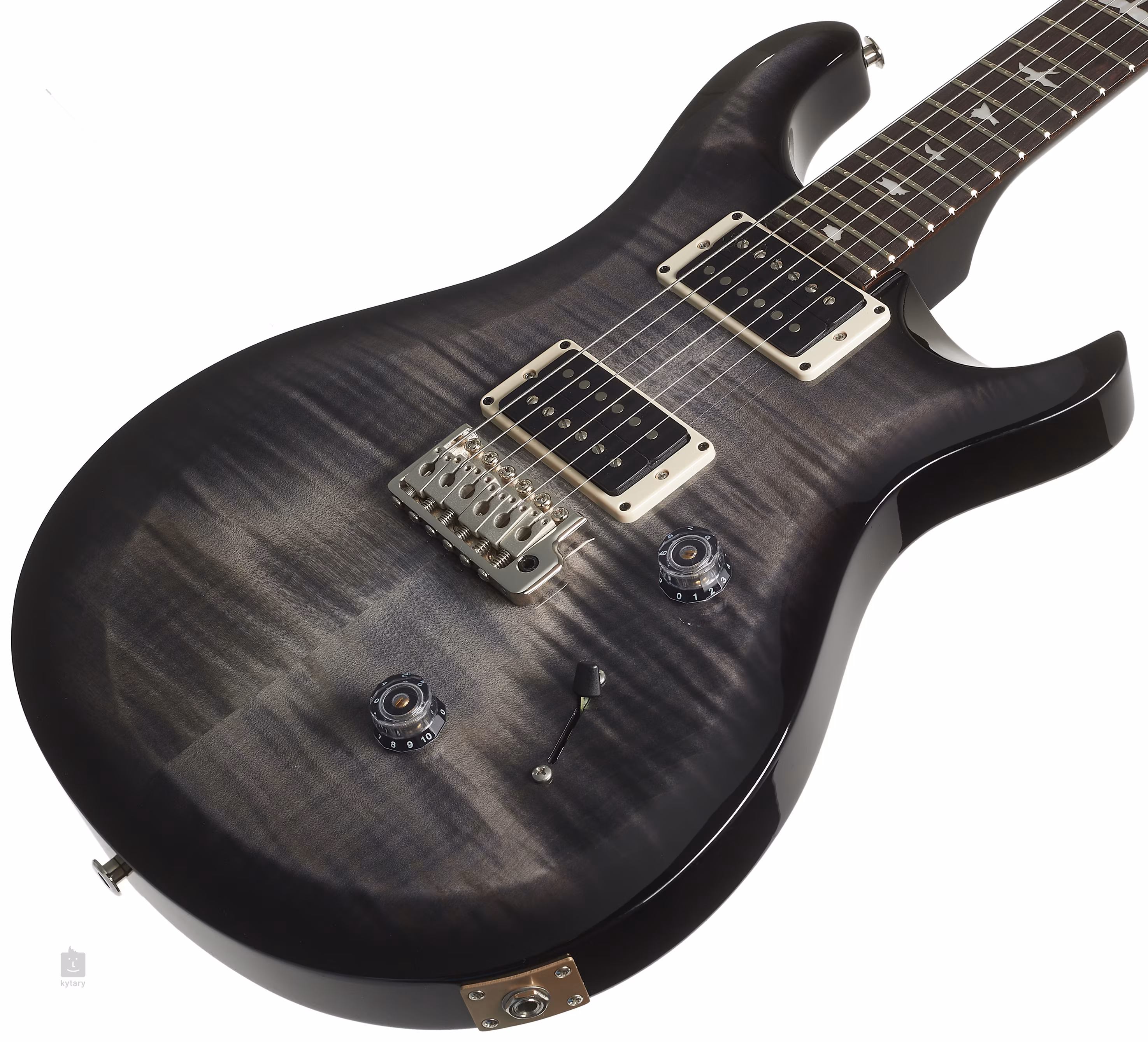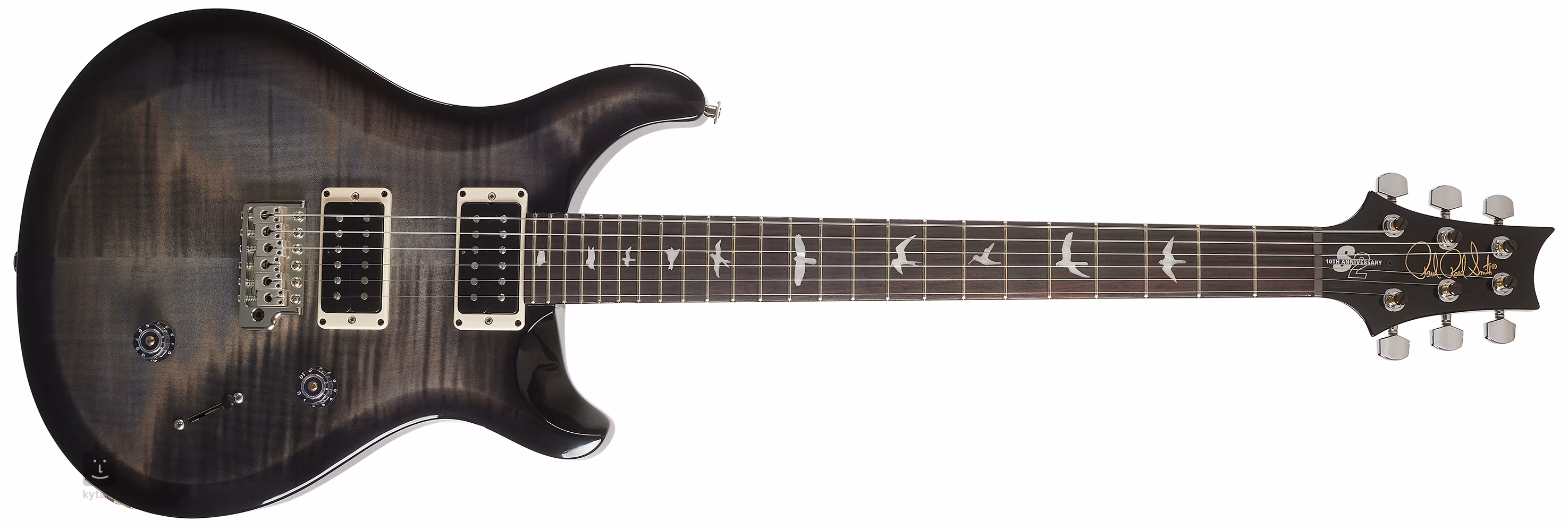 Mahagonové tělo kytary S2 10th Anniversary Custom 24 Faded Gray Black Burst s charakteristickým PRS double-cut designem zdobí efektní top z fládrovaného javoru a lesklý lak. Výrazně zkosené hrany těla podporují celkovou ergonomii hry. Ke krku z kubánského mahagonu s profilem Pattern Thin je přilepen palisandrový hmatník osazený čtyřiadvaceti pražci. Orientaci po ploše hmatníku usnadňují polohové značky v podobě perleťových ptačích siluet (Mother of Pearl).