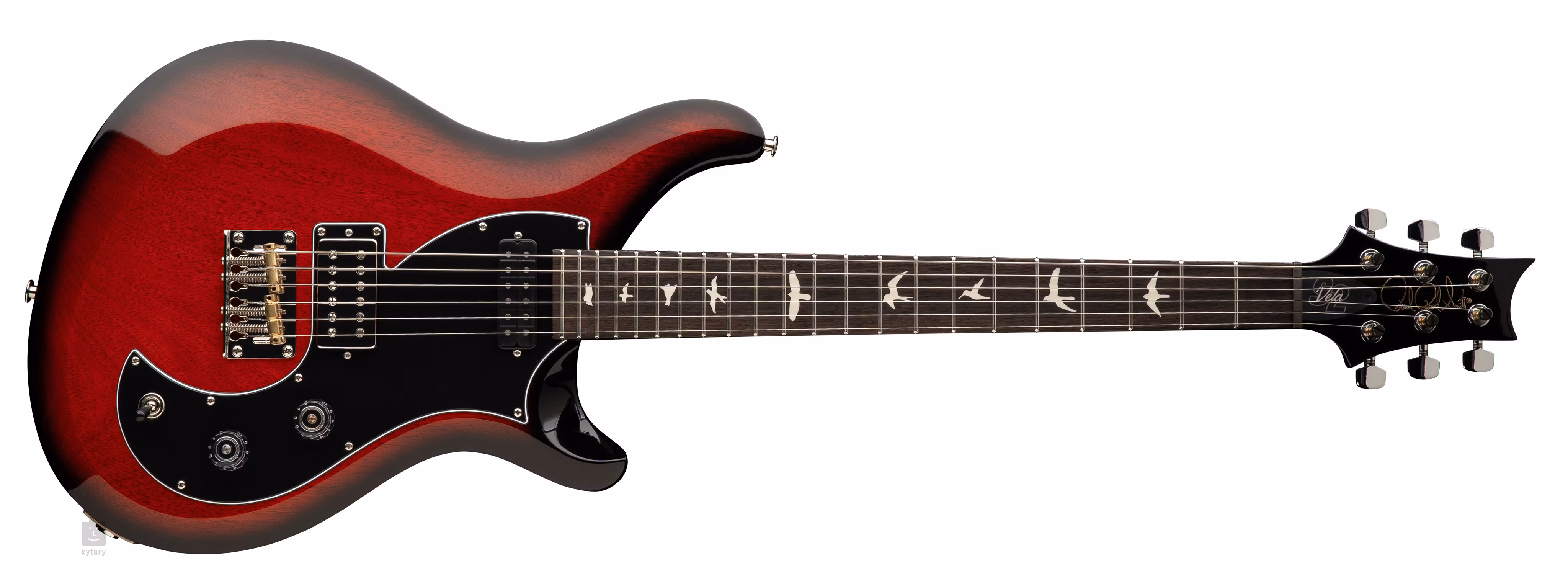 Mahagonové tělo kytary S2 Vela Scarlet Sunburst zdobí lesklý nitrolak. K mahagonovému krku s profilem Pattern Regular je přilepen palisandrový hmatník osazený dvaadvaceti pražci. Orientaci na hmatníku usnadňují polohové značky v podobě ptačích siluet.