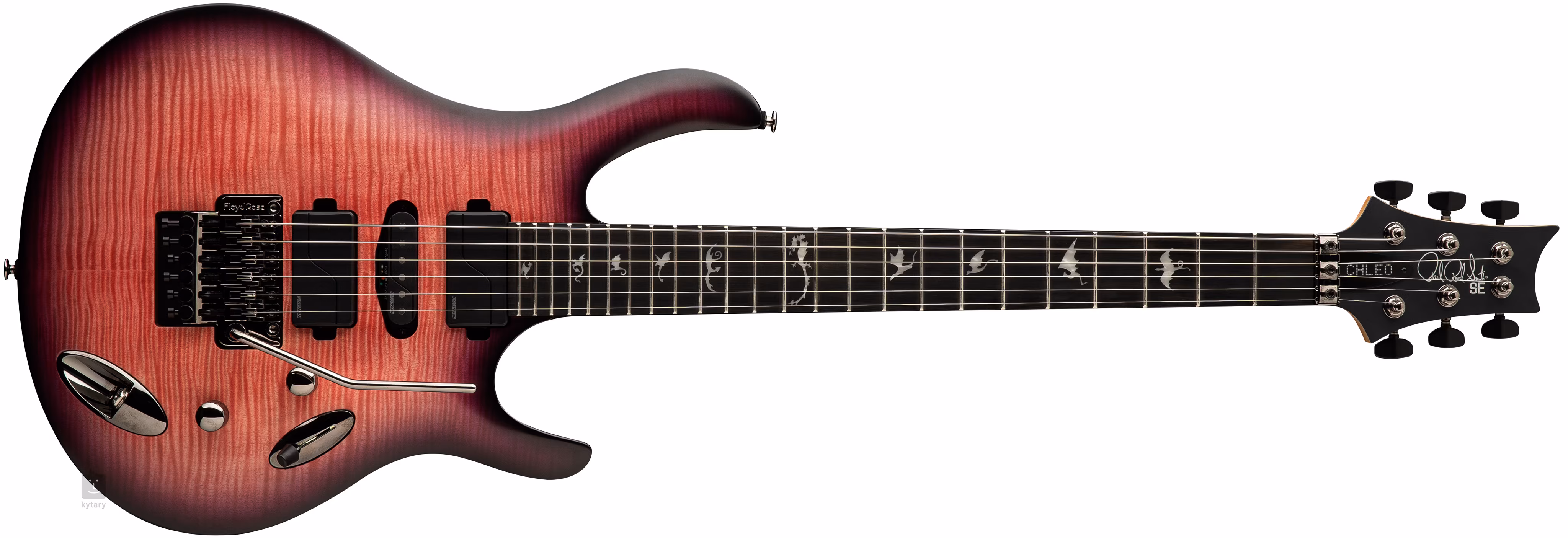 Mahagonové tělo elektrické kytary SE Chleo Orchid Dusk zdobí tvarovaný javorový top a vrchní dýha z fládrovaného javoru. K úzkému rychlému javorovému krku je přilepen ebenový hmatník osazený čtyřiadvaceti pražci. Krk zpevňují výztuže z karbonových vláken, hmatník dekorují polohové značky v designu “Eclipse Dragon”.