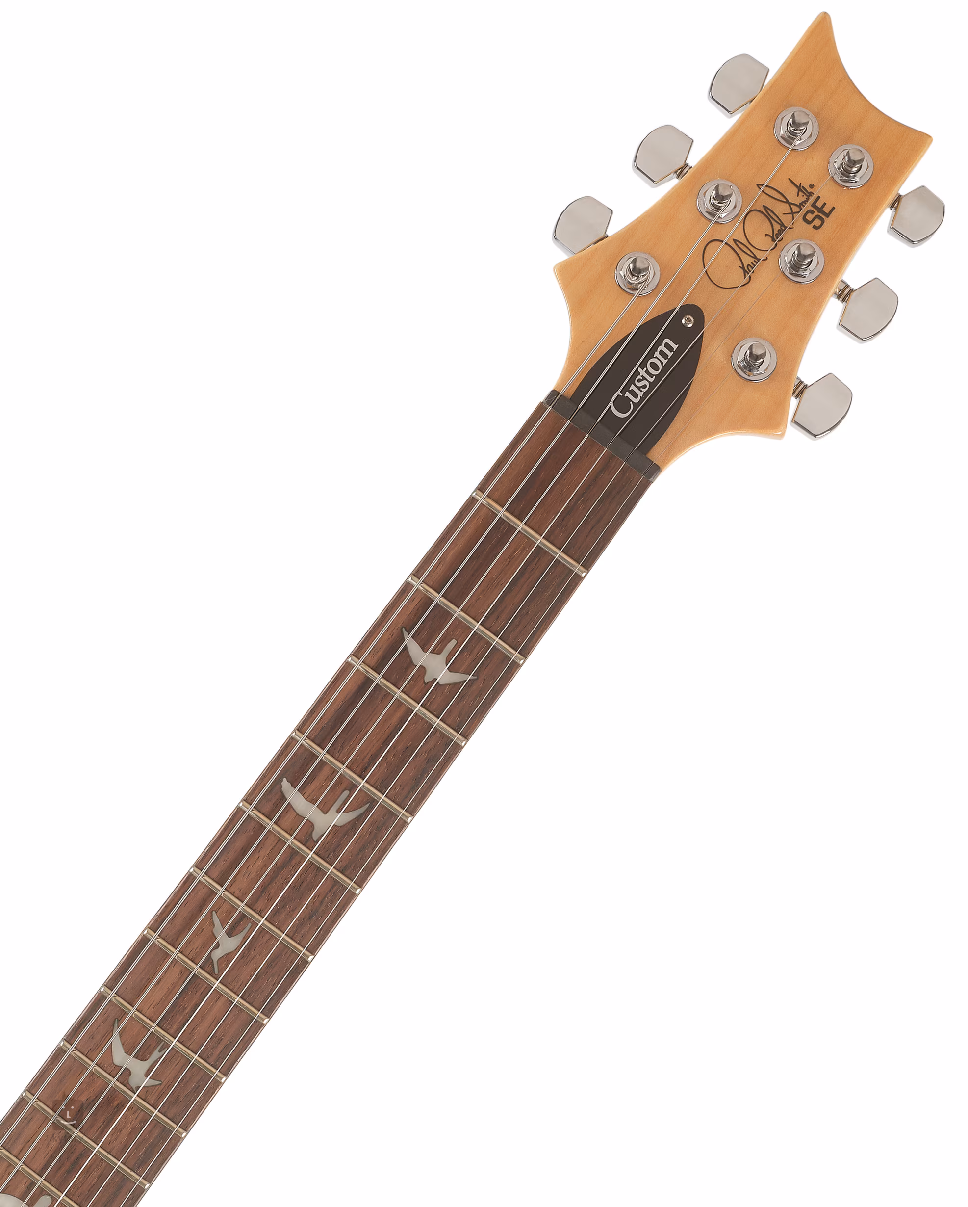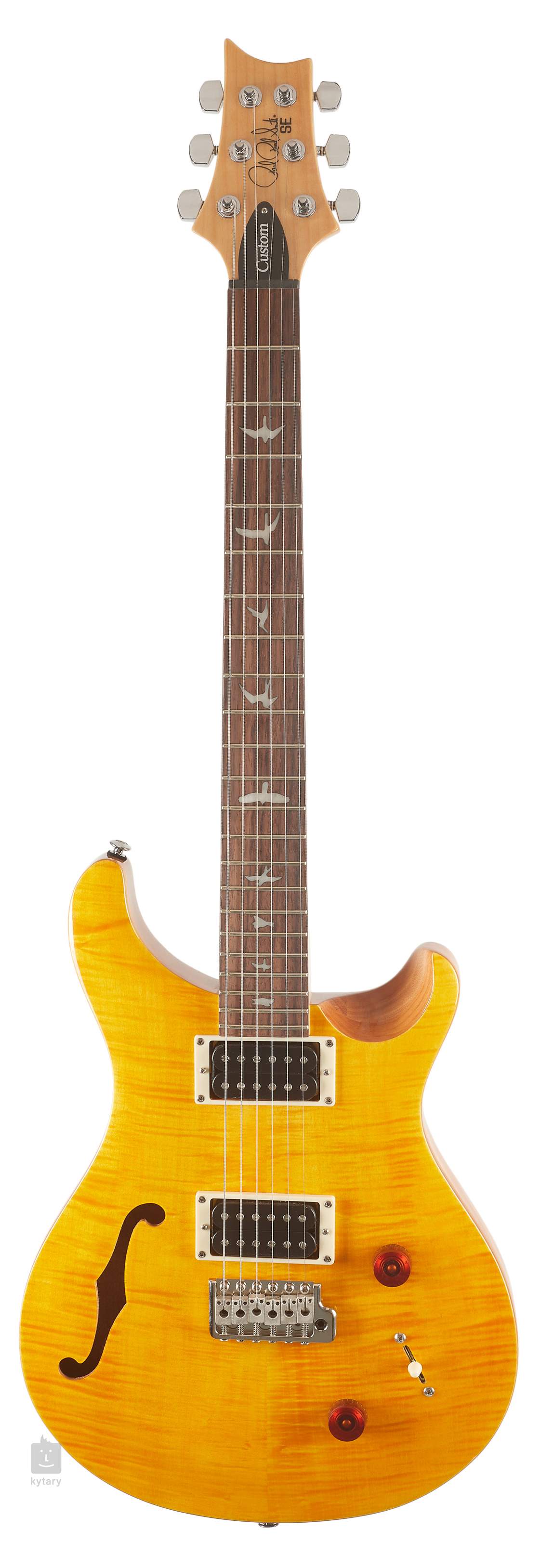 Mahagonové tělo kytary SE CUSTOM 22 SEMI-HOLLOW Santana Yellow zdobí javorový top a efektní vrchní dýha fládrovaného javoru. Výřez Shallow Violin carve přibližuje kvalitou herní vlastnosti nástroje k dražším americkým modelům série Core. K javorovému krku s profilem Wide Thin je přilepen palisandrový hmatník osazený čtyřiadvaceti pražci. Orientaci po ploše hmatníku usnadňují polohové značky v podobě perleťových ptačích siluet.