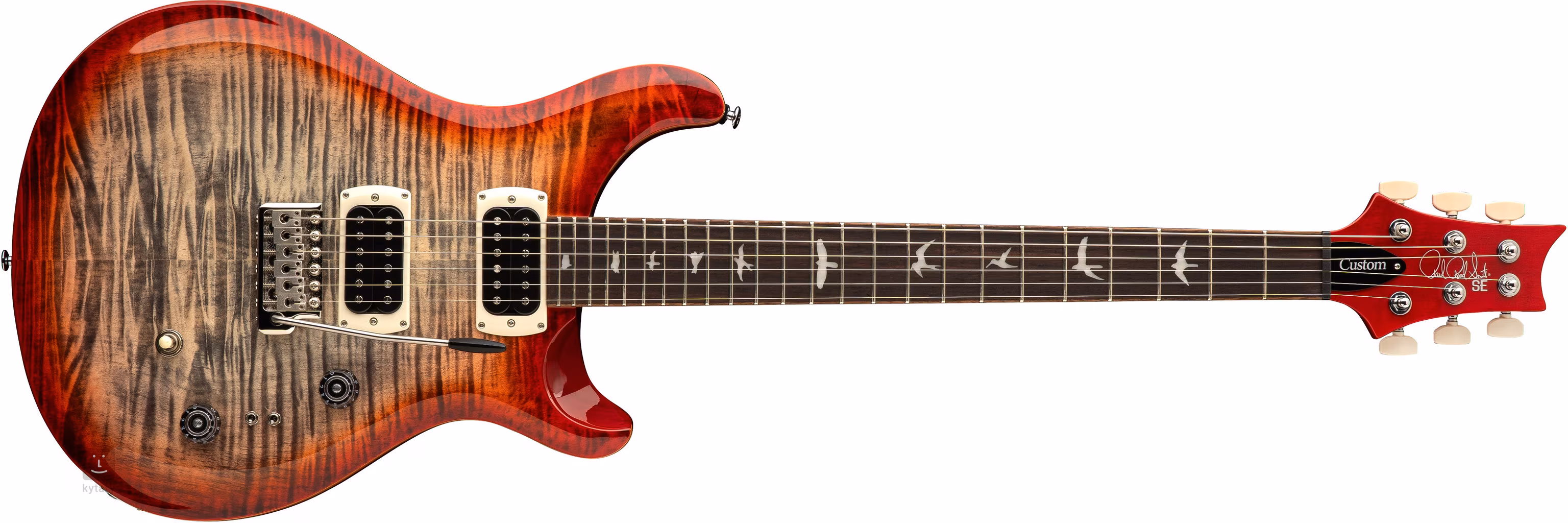 Mahagonové tělo kytary SE Custom 24-08 Charcoal Cherry Burst 2026 zdobí javorový top a efektní vrchní dýha z fládrovaného javoru. Výřez Shallow Violin carve přibližuje kvalitou herní vlastnosti nástroje k dražším americkým modelům série Core. K javorovému krku s profilem Wide Thin je přilepen palisandrový hmatník osazený čtyřiadvaceti pražci. Orientaci na hmatníku usnadňují polohové značky v podobě ptačích siluet.