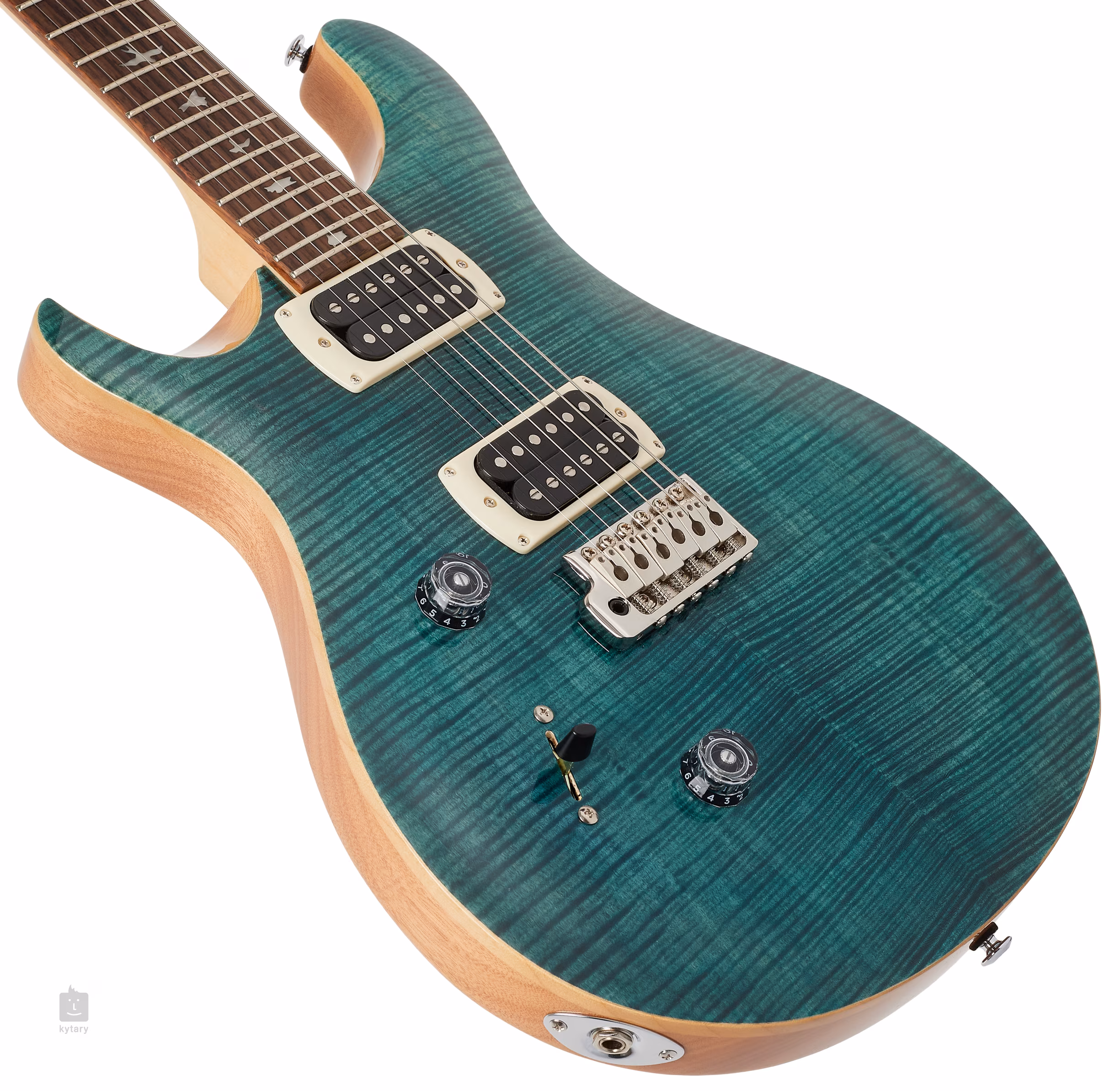 Mahagonové tělo kytary pro leváky SE Custom 24 LH Slate Blue 2026 zdobí javorový top a efektní vrchní dýha z fládrovaného javoru. Výřez Shallow Violin carve přibližuje kvalitou herní vlastnosti nástroje k dražším americkým modelům série Core. K javorovému krku s profilem Wide Thin je přilepen palisandrový hmatník osazený čtyřiadvaceti pražci. Orientaci na hmatníku usnadňují polohové značky v podobě ptačích siluet.