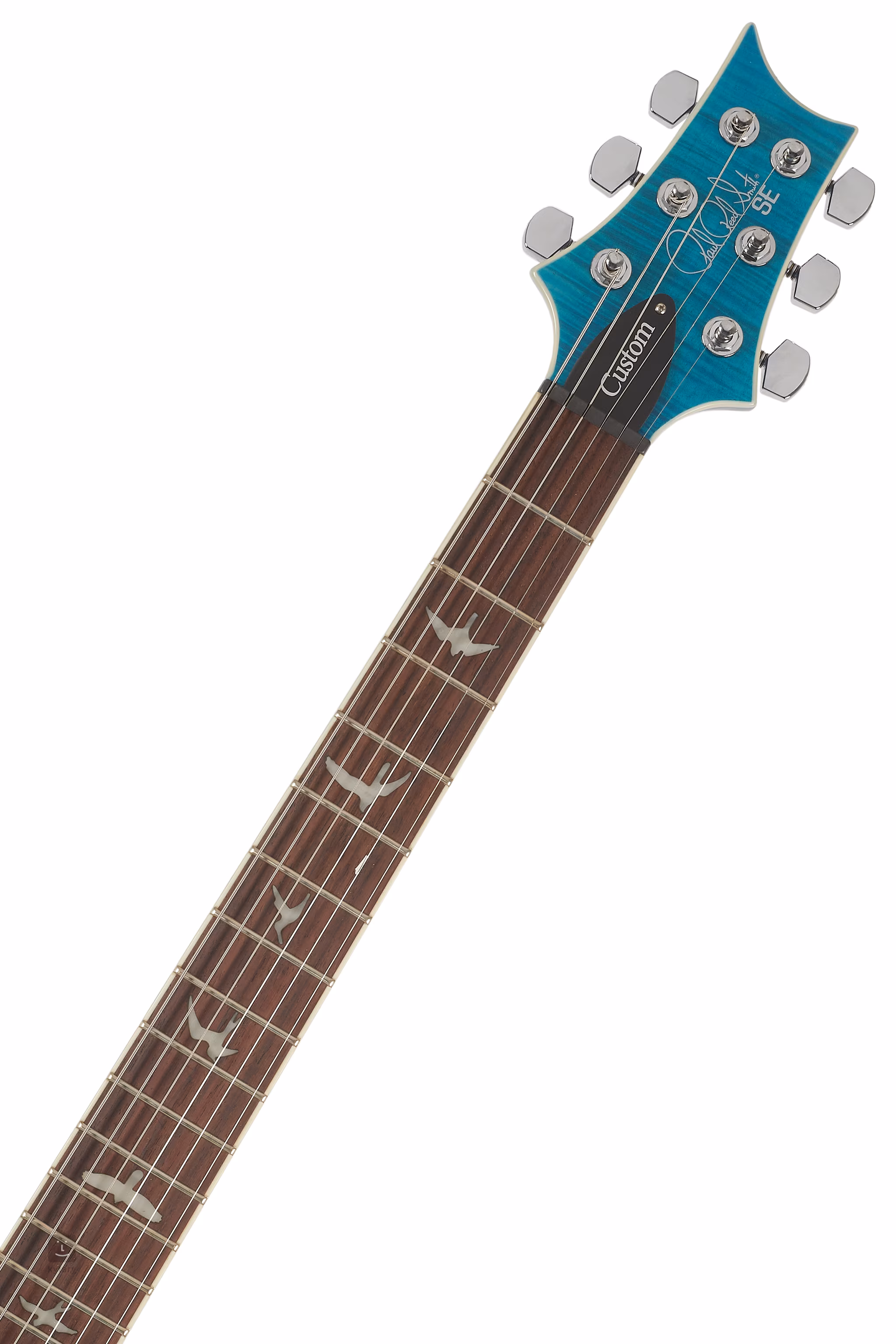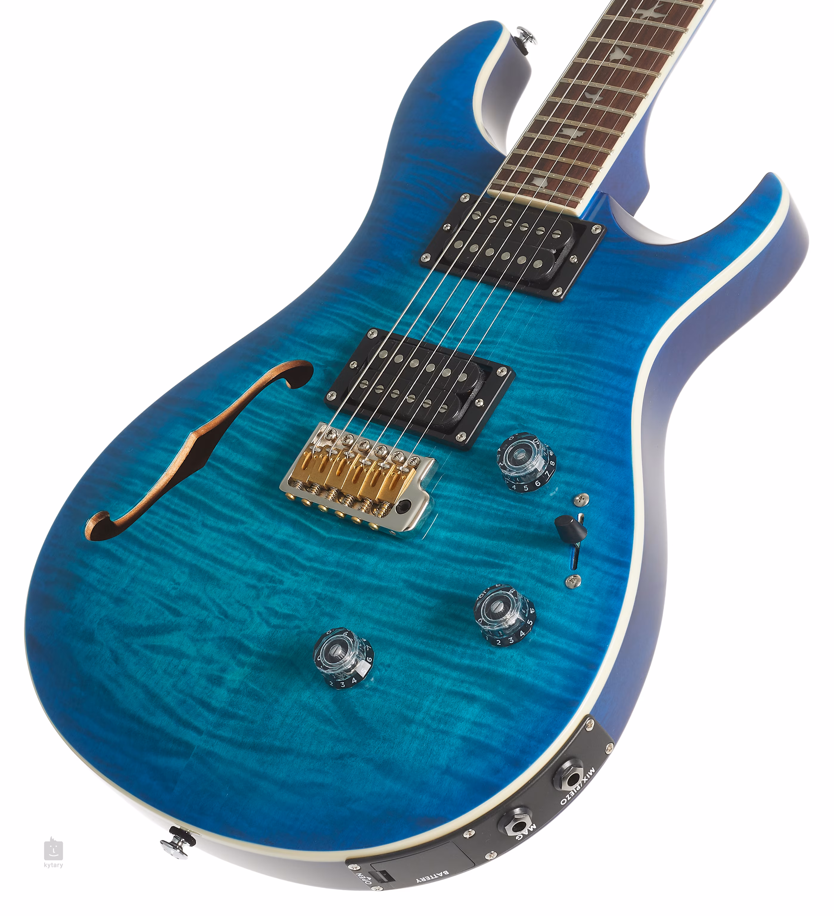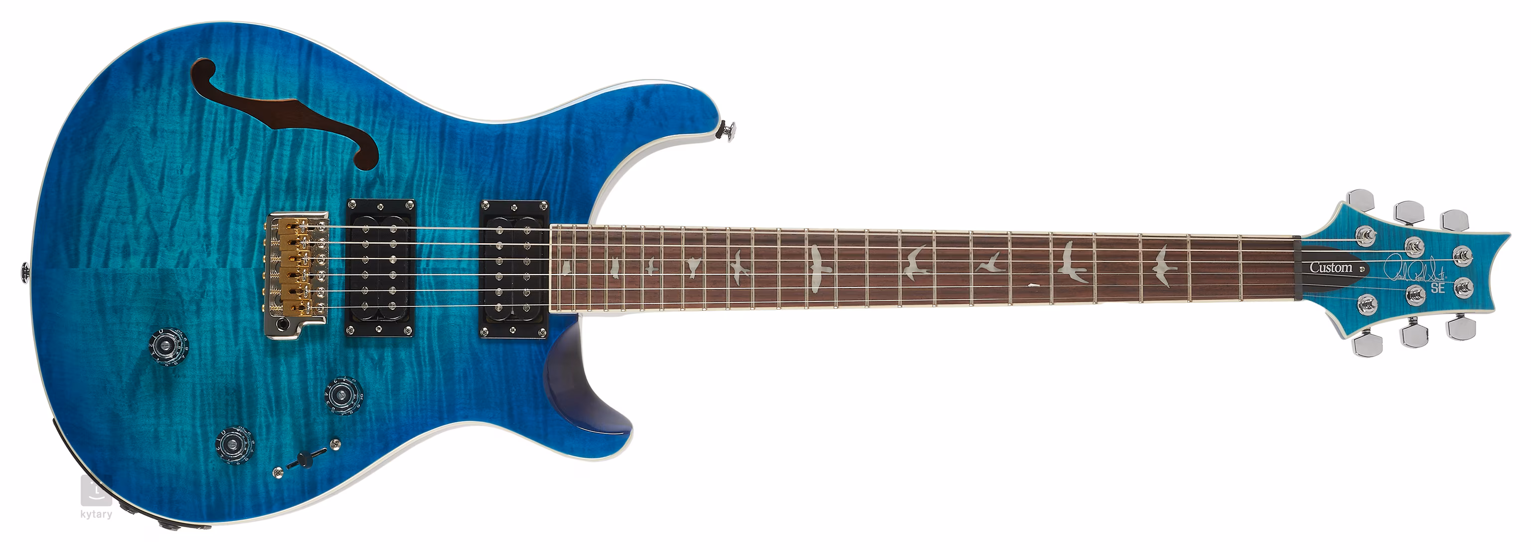 Mahagonové tělo kytary SE Custom 24 Semi-Hollow Piezo Lake Blue zdobí javorový top a efektní vrchní dýha fládrovaného javoru. Výřez Shallow Violin carve přibližuje kvalitou herní vlastnosti nástroje k dražším americkým modelům série Core. K javorovému krku s profilem Wide Thin je přilepen palisandrový hmatník osazený čtyřiadvaceti pražci. Orientaci na hmatníku usnadňují polohové značky v podobě perleťových ptačích siluet.