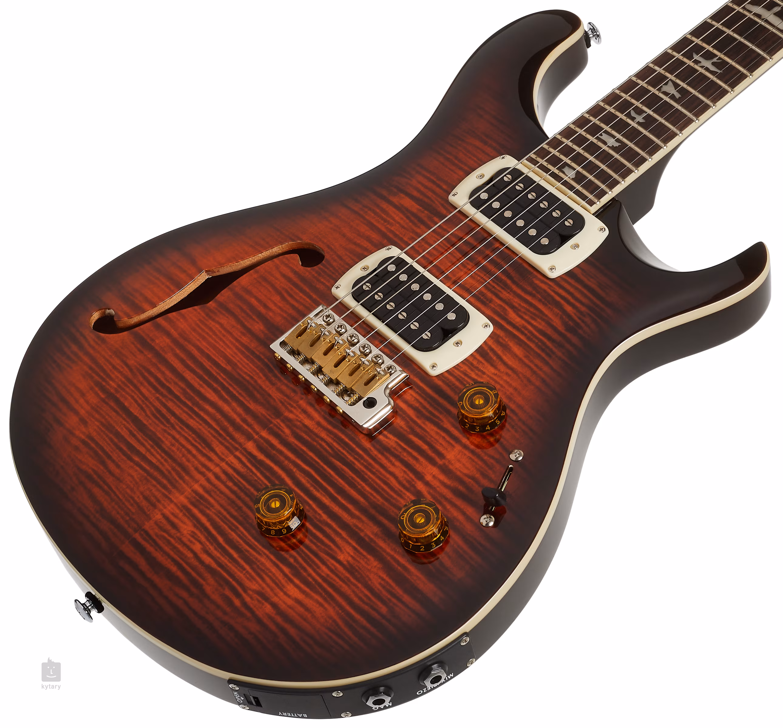 Mahagonové tělo kytary SE Custom 24 Semi-Hollow Piezo Orange Tiger Smokeburst 2026 zdobí javorový top a efektní vrchní dýha fládrovaného javoru. Výřez Shallow Violin carve přibližuje kvalitou herní vlastnosti nástroje k dražším americkým modelům série Core. K javorovému krku s profilem Wide Thin je přilepen palisandrový hmatník osazený čtyřiadvaceti pražci. Orientaci na hmatníku usnadňují polohové značky v podobě ptačích siluet.