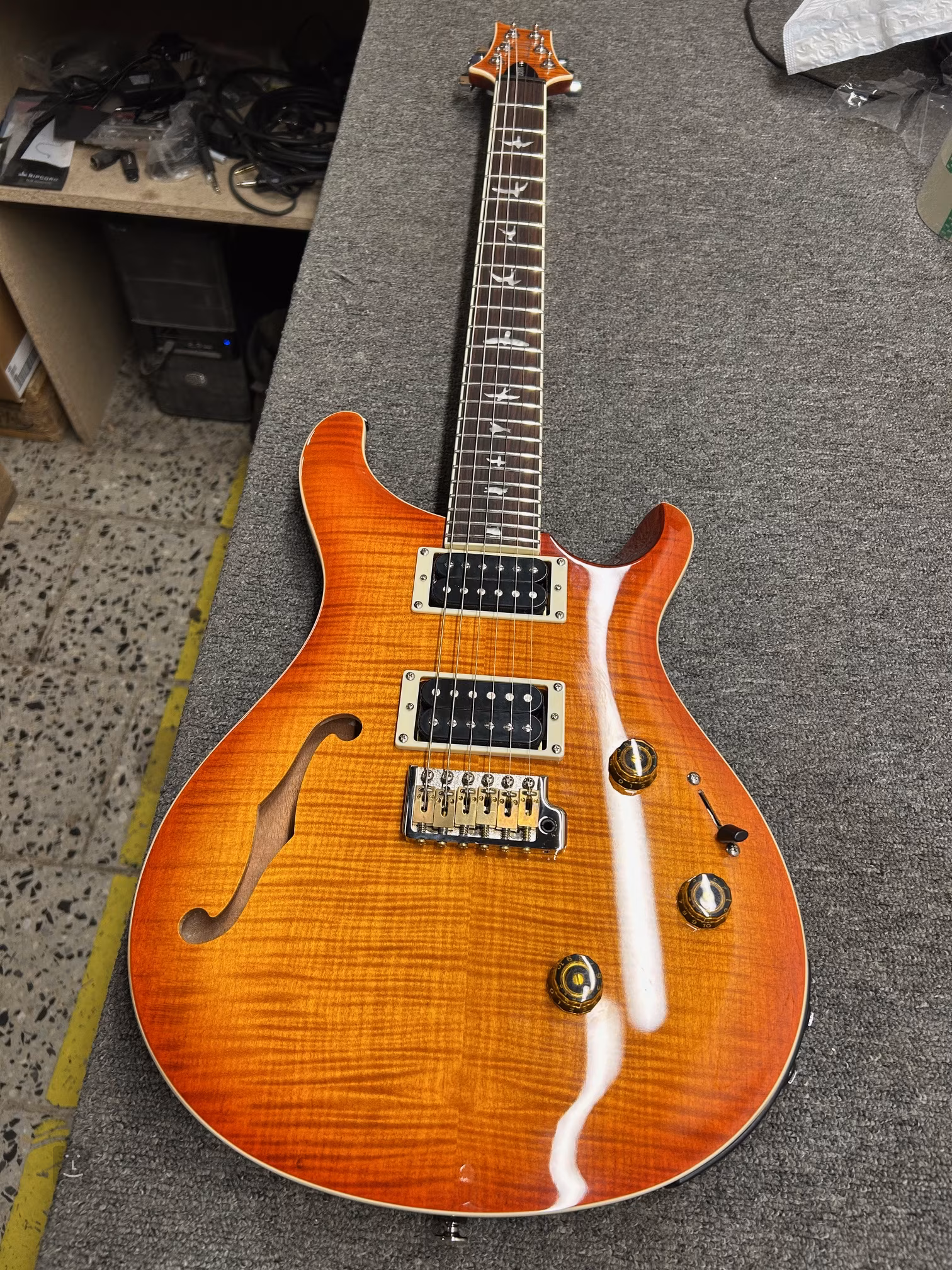 Mahagonové tělo kytary SE Custom 24 Semi-Hollow Piezo Vintage Sunburst zdobí javorový top a efektní vrchní dýha fládrovaného javoru. Výřez Shallow Violin carve přibližuje kvalitou herní vlastnosti nástroje k dražším americkým modelům série Core. K javorovému krku s profilem Wide Thin je přilepen palisandrový hmatník osazený čtyřiadvaceti pražci. Orientaci na hmatníku usnadňují polohové značky v podobě perleťových ptačích siluet.