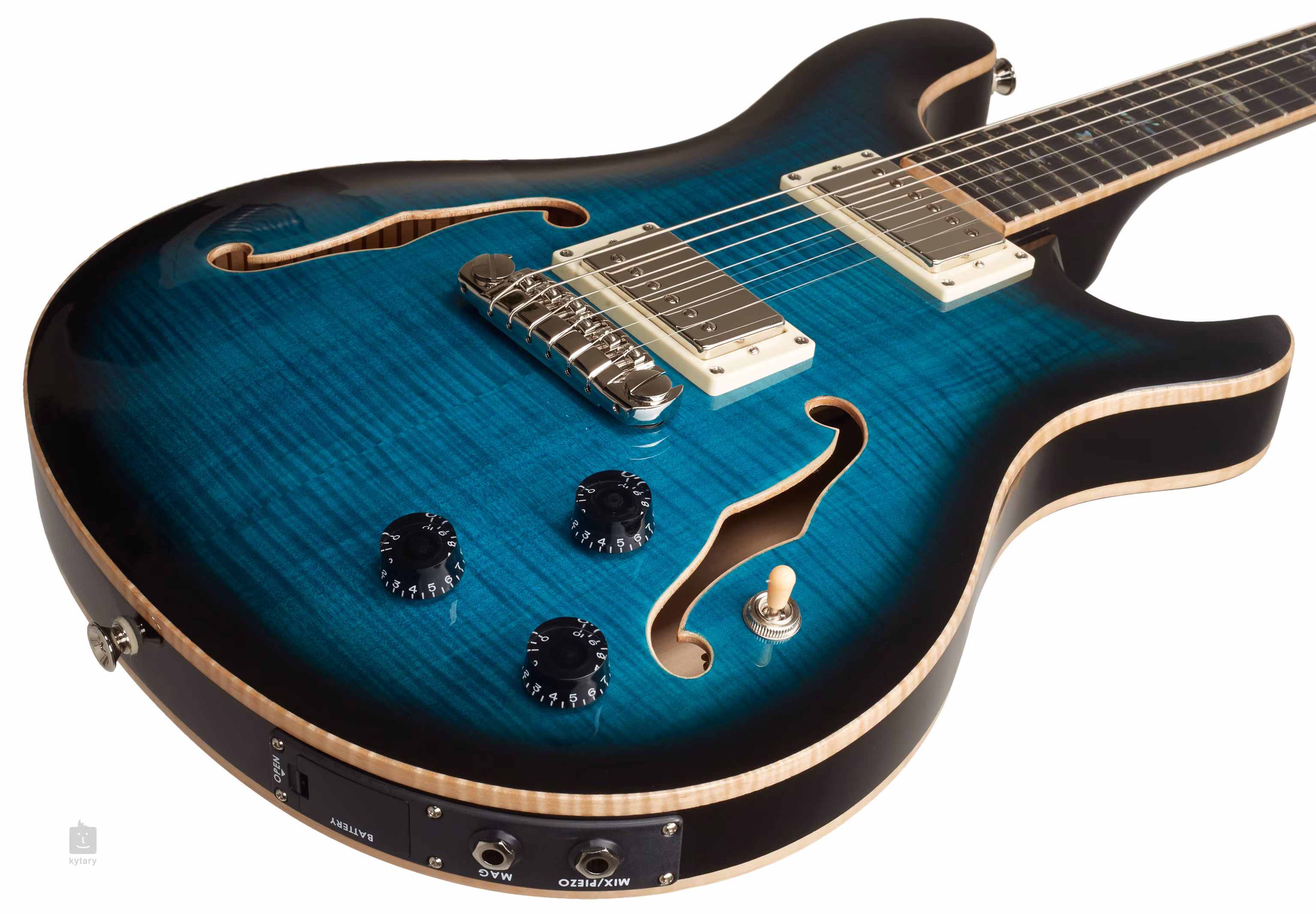 Lubová kytara PRS Hollowbody II Piezo z cenově dostupnější řady SE spojuje vřelý vyvážený rezonantní zvuk lubového se stabilitou celomasivních elektrických kytar. Tělo nástroje je složeno z přední a zadní desky z pěti vrstev laminovaného javoru, mahagonových lubů a efektní vrchní dýhy dýhy z fládrovaného javoru. K mahagonovému krku s „Wide Fat“ profilem je přilepen ebenový hmatník osazený dvaadvaceti pražci. Orientaci na hmatníku usnadňují polohové značky v podobě perleťových ptačích siluet.