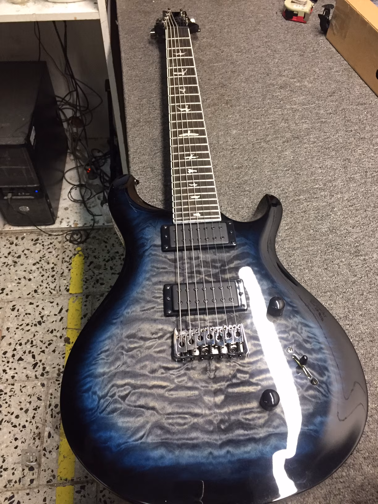 Sedmistrunná kytara SE MARK HOLCOMB - SVN Holcomb Blue Burst je cenově dostupnější nástroj z řady SE. Mahagonové tělo kytary zdobí tvarovaný javorový top a efektní vrchní dýha z obláčkového javoru. Výřez Shallow Violin carve přibližuje kvalitou herní vlastnosti nástroje k dražším americkým modelům série Core. K javorovému krku s profilem Wide Thin je přilepen ebenový hmatník osazený čtyřiadvaceti pražci. Orientaci po ploše hmatníku usnadňují polohové značky v podobě perleťových ptačích siluet. Specifikem nástroje je delší menzura (673 mm) a plochý rádius hmatníku (20 palců), který bude vyhovovat rychlým technicky zdatným hráčům.
