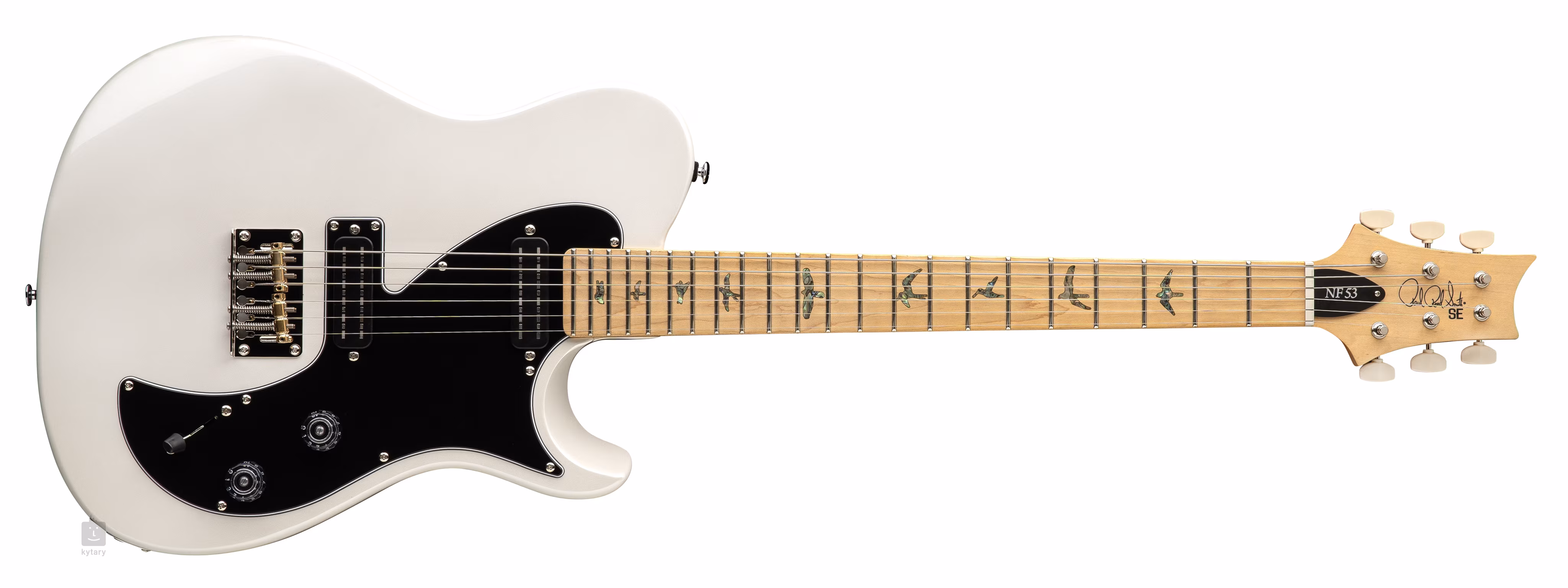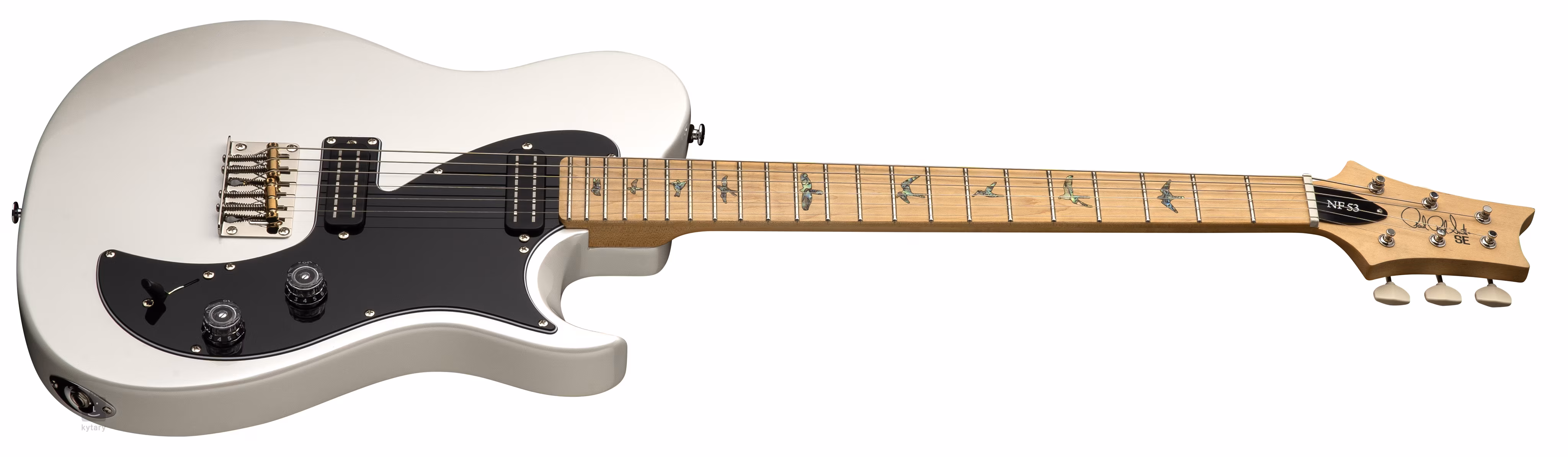 Tělo elektrické kytary SE NF 53 Pearl White je zhotoveno z bahenního jasanu. Herní komfort zaručuje přišroubovaný javorový krk, který je u nultého pražce o něco užší než je běžný PRS standard. Orientaci na javorovém hmatníku usnadňují polohové značky v podobě ptačích siluet.