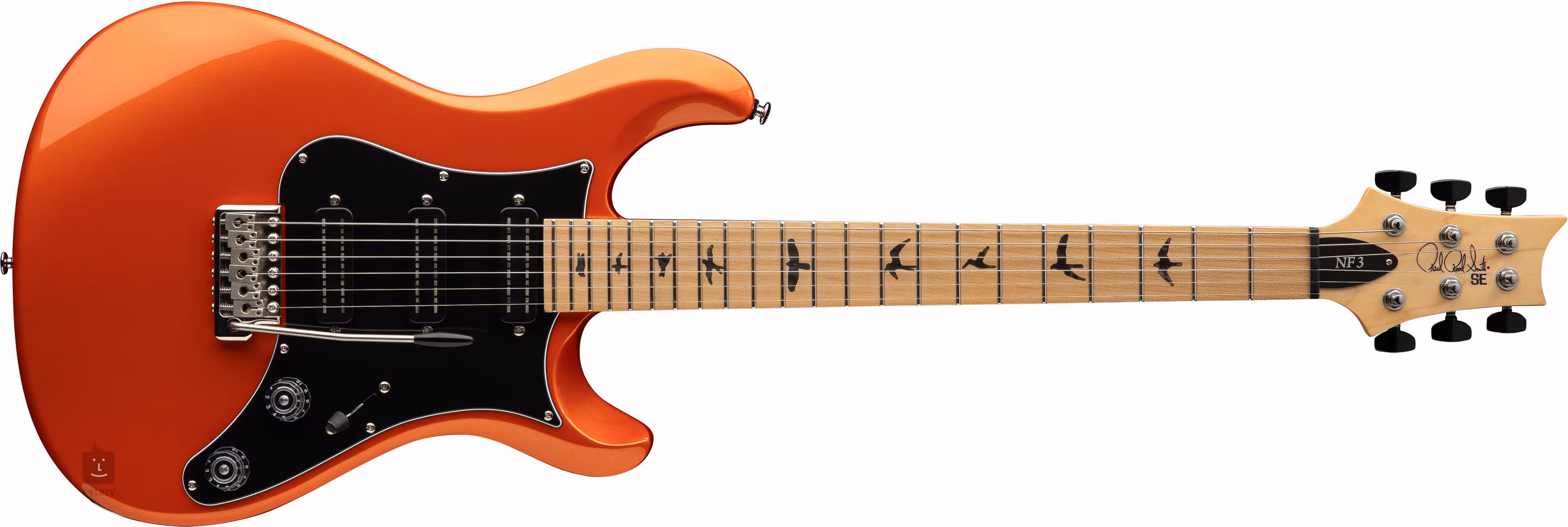 Tělo kytary SE NF3 MN Metallic Orange 2026 je zhotoveno z topolu. Přišroubovaný javorový krk nabízí profil Wide Thin. Orientaci na javorovém hmatníku usnadňují polohové značky v podobě ptačích siluet.