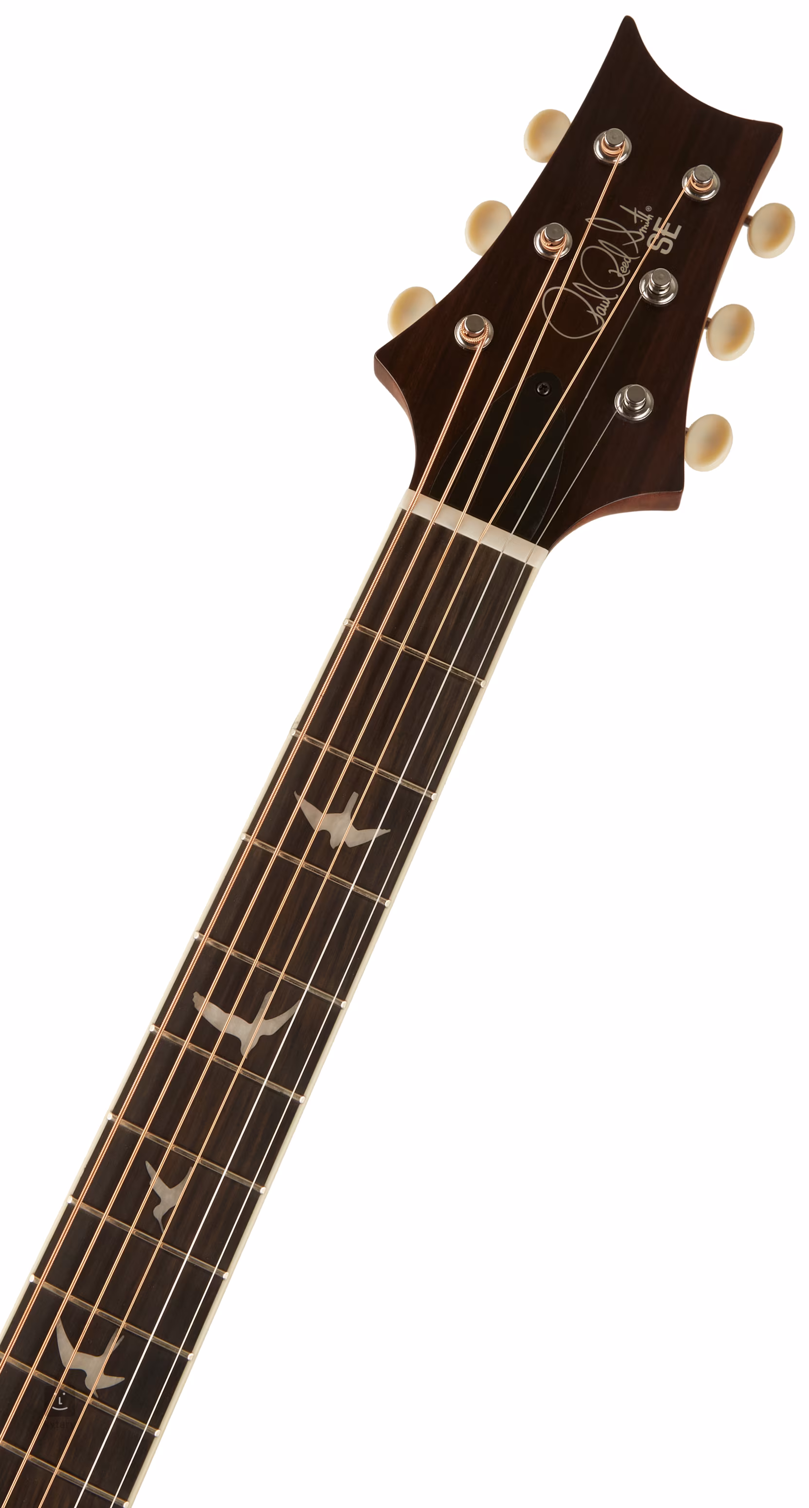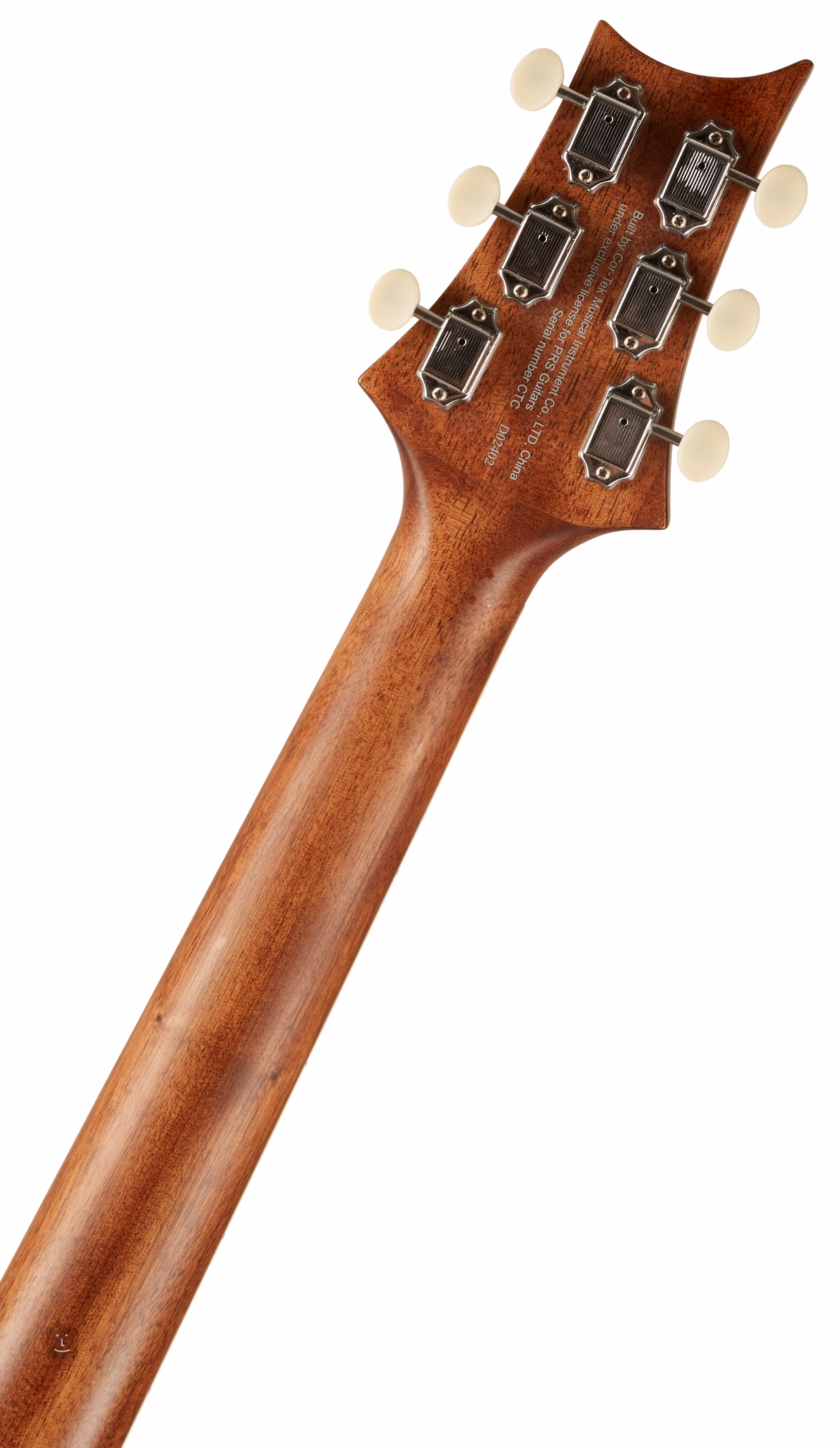 K mahagonovému krku s profilem Wide Fat je přilepen ebenový hmatník vyložený „trademark PRS“ polohovými značkami v podobě ptačích siluet. Stabilitu ladění zaručuje uchycení strun přes nultý a sedlový pražec z kosti v ladících mechanikách s kolíčky Butterbean a ebenové kobylce. Pěkné zpracování nástroje podtrhuje matný finiš přední desky, stylová PRS hlavice a krémová obvodová lemovka a rozeta se zdobným vzorem rybí kosti (Herringbone).