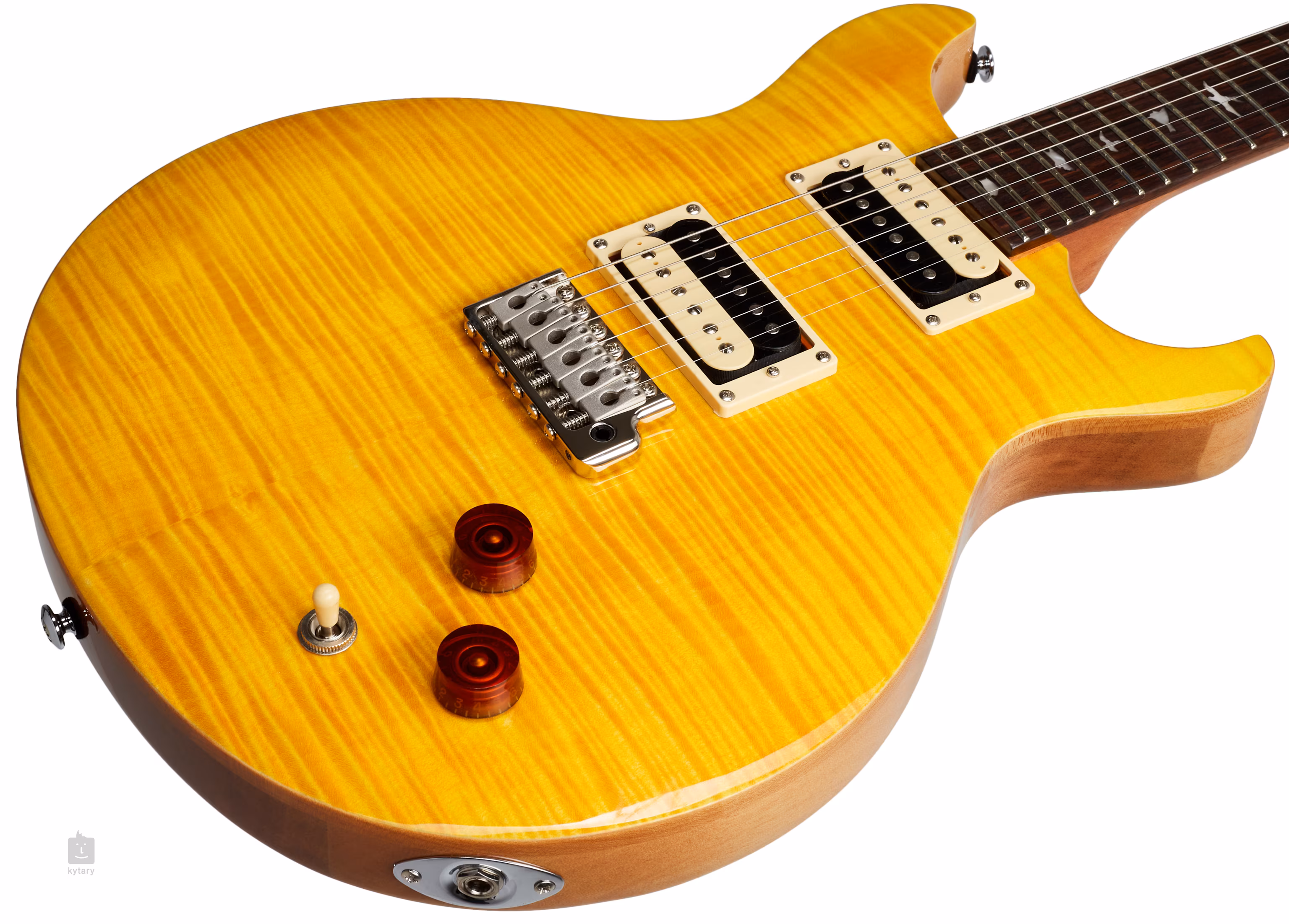 Dvojice humbuckerů poskytuje kytaře vřelý, konkrétní, zvuk, kterým vykouzlíte jak typická santanovská sóla, tak i hutný, rockový, overdrive. Barvu zvuku lze kontrolovat ovladačem hlasitosti a tónové clony. Nechybí třípolohový přepínač, kterým vyberete mezi jednotlivými snímači nebo zapojíte oba. Struny jsou usazeny v továrním jednozvratném tremolu, stabilitu ladění zaručují kvalitní PRS mechaniky. Kresbu fládrovaného javoru doplňuje krémová lemovka, hlavici kytary zdobí firemní logo.