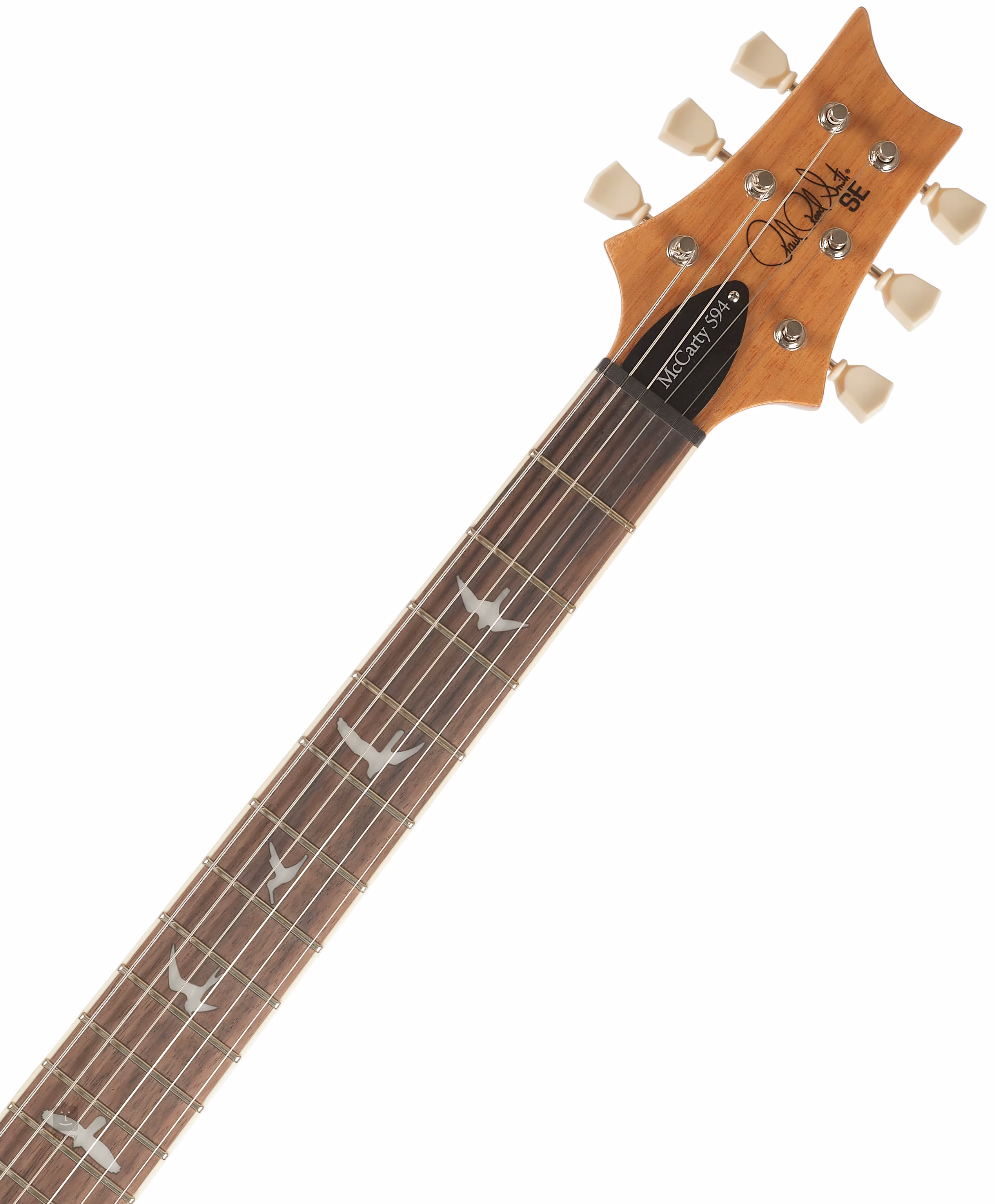 Mahagonové tělo kytary Singlecut McCarty 594 Charcoal zdobí javorový top a efektní dýha z fládrovaného javoru. Výřez Shallow Violin carve přibližuje kvalitou herní vlastnosti nástroje k dražším americkým modelům série Core. K mahagonovému krku s profilem Pattern Vintage je přilepen lemovaný palisandrový hmatník osazený dvaadvaceti pražci. Samozřejmostí je kratší menzura kytary (625 mm) zakotvená v označení modelů McCarty 594 (24.594 palců). Orientaci na hmatníku usnadňují polohové značky v podobě ptačích siluet.