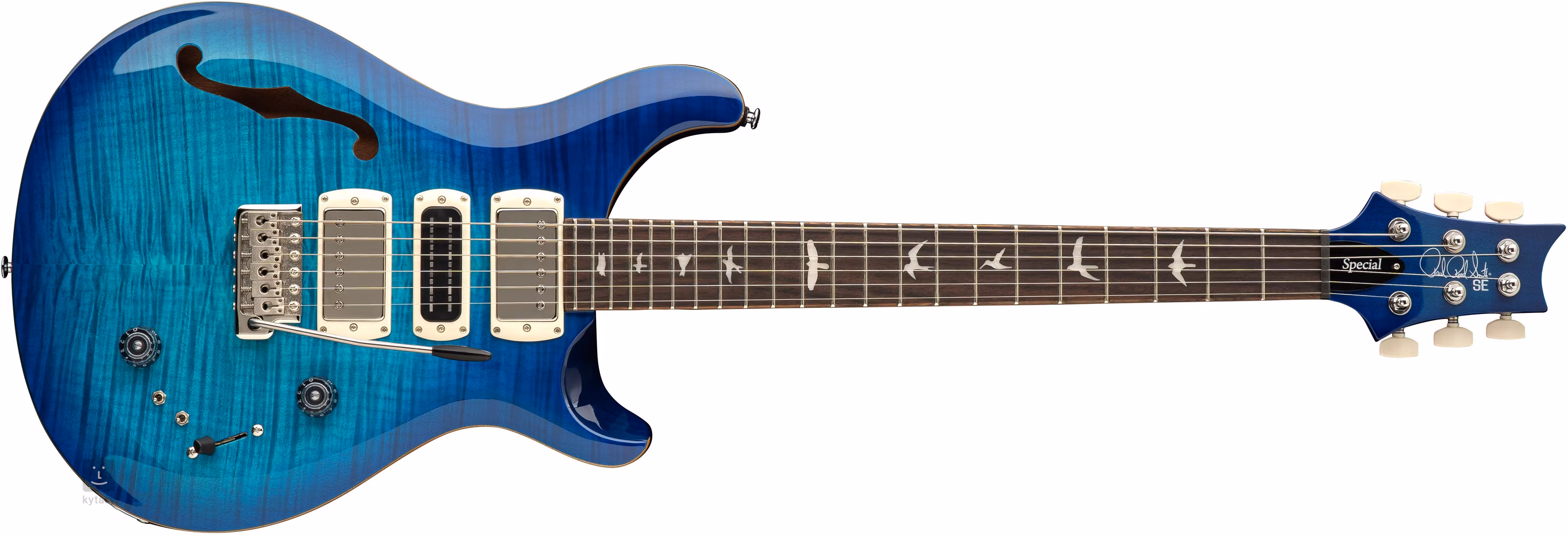 Pololubové mahagonové tělo s jedním F výřezem kytary SE Special Semi-Hollow Lake Blue 2026 zdobí javorový top a efektní vrchní dýha z fládrovaného javoru. Výřez Shallow Violin carve přibližuje kvalitou herní vlastnosti nástroje k dražším americkým modelům série Core. K javorovému krku s profilem Wide Thin je přilepen palisandrový hmatník osazený dvaadvaceti pražci. Orientaci na hmatníku usnadňují polohové značky v podobě ptačích siluet.