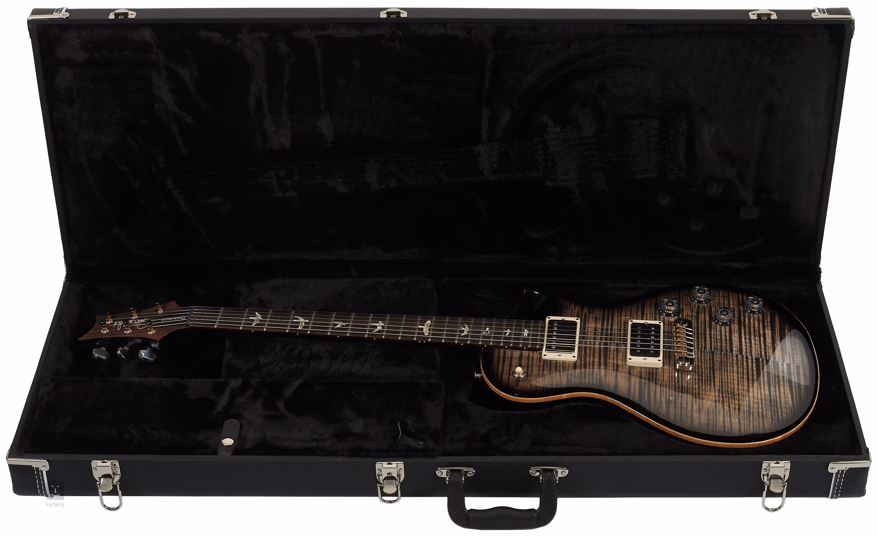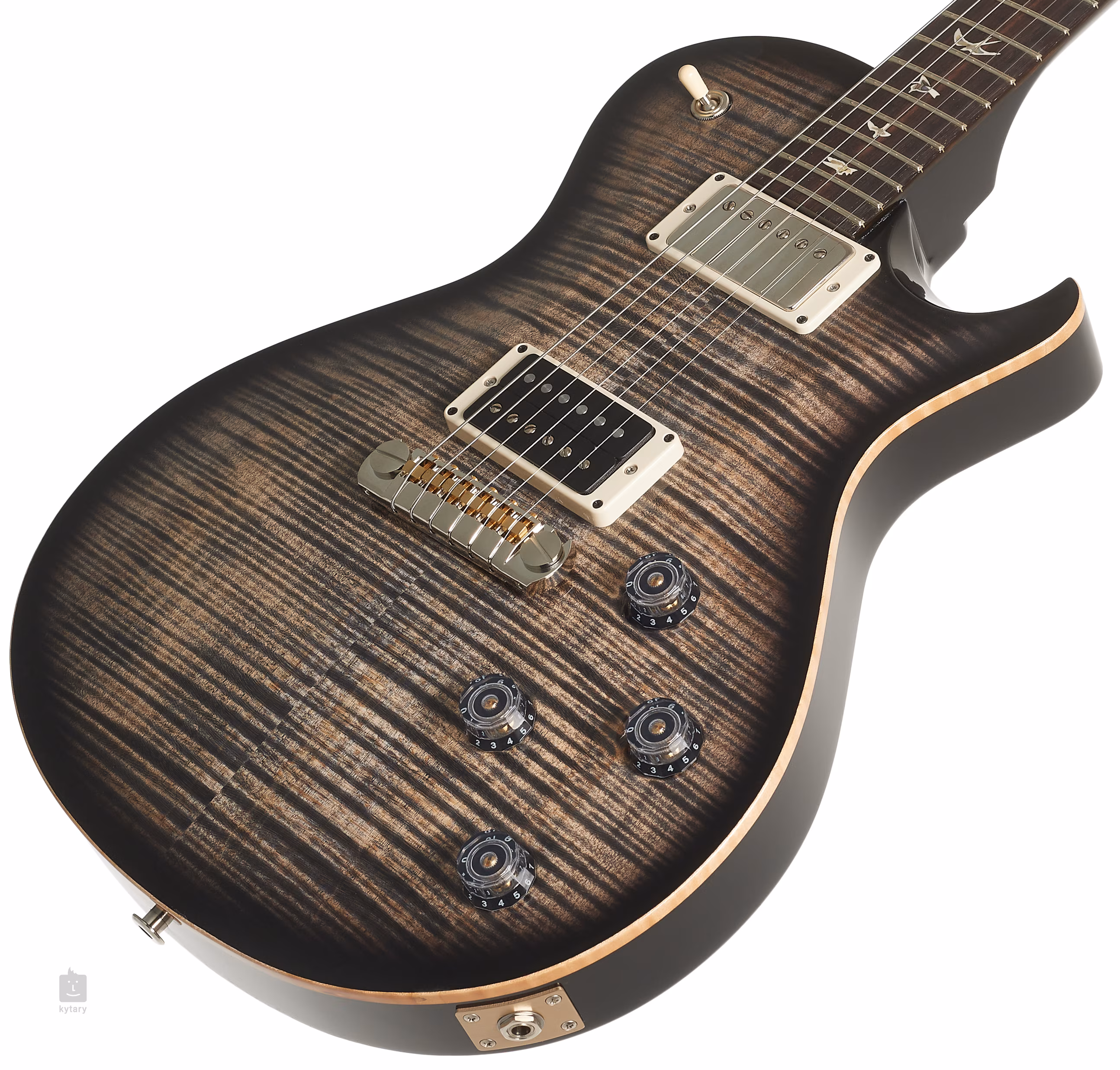 Single-cut PRS Tremonti Stoptail Charcoal Contour Burst je signature model Marka Tremontiho, amerického kytaristy známého z kapel Creed a Alter Bridge. Ergonomicky tvarované mahagonové tělo kytary zdobí top z figurovaného javoru a lesklý nitrolak. Ke krku z jednoho kusu mahagonu s profilem Pattern Thin je přilepen palisandrový hmatník osazený dvaadvaceti pražci. Orientaci na hmatníku usnadňují trademark PRS polohové značky v podobě luxusních perleťových ptačích siluet.