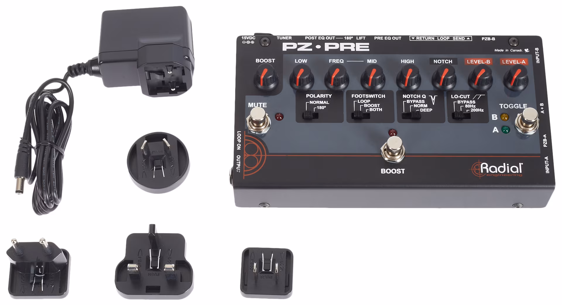 Univerzální dvoukanálový akustický předzesilovač s PZB piezo boosterem vhodný pro strunné a smyčcové nástroje. Hlavní panel obsahuje třípásmový ekvalizér, Boost, přepínač polarity, Notch Q, Low Cut filtr a tři nožní spínače. Dva postranní linkové vstupy a jeden výstup potom doplňuje efektové smyčka, výstup pro ladičku a Dry/Wet XLR výstup na zadním panelu pro pódiový monitor, mixpult, nebo aktivní PA systém.