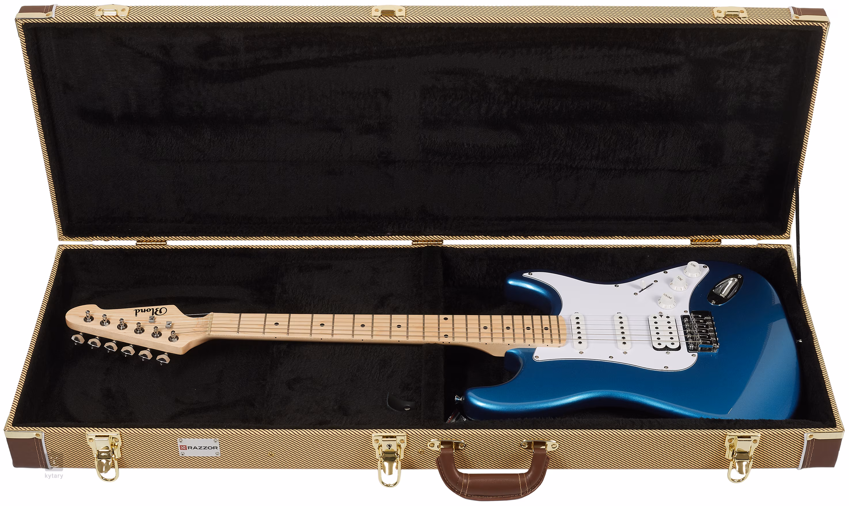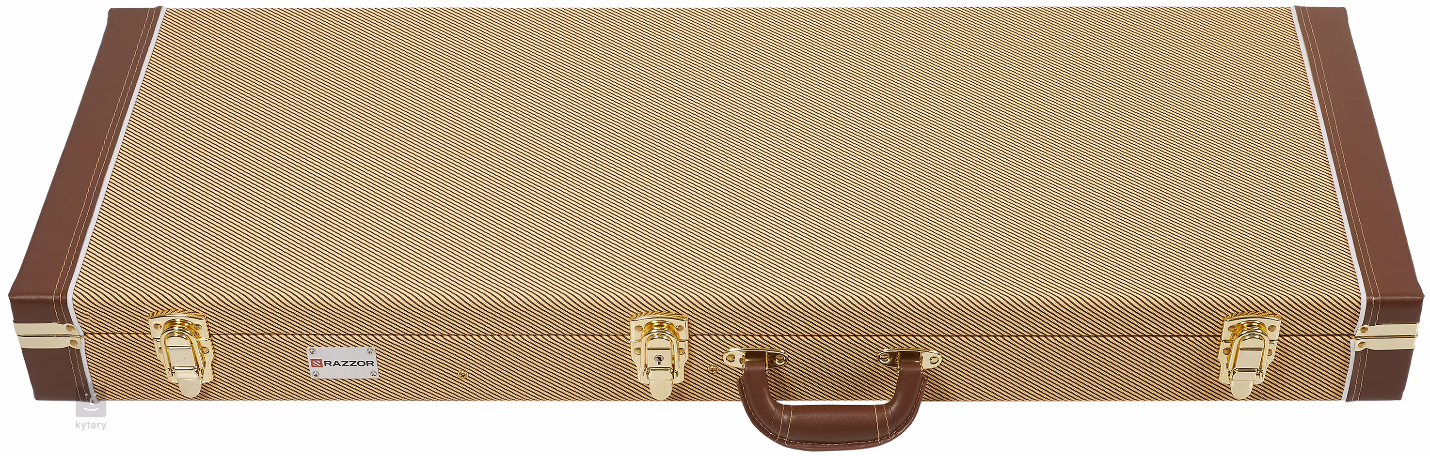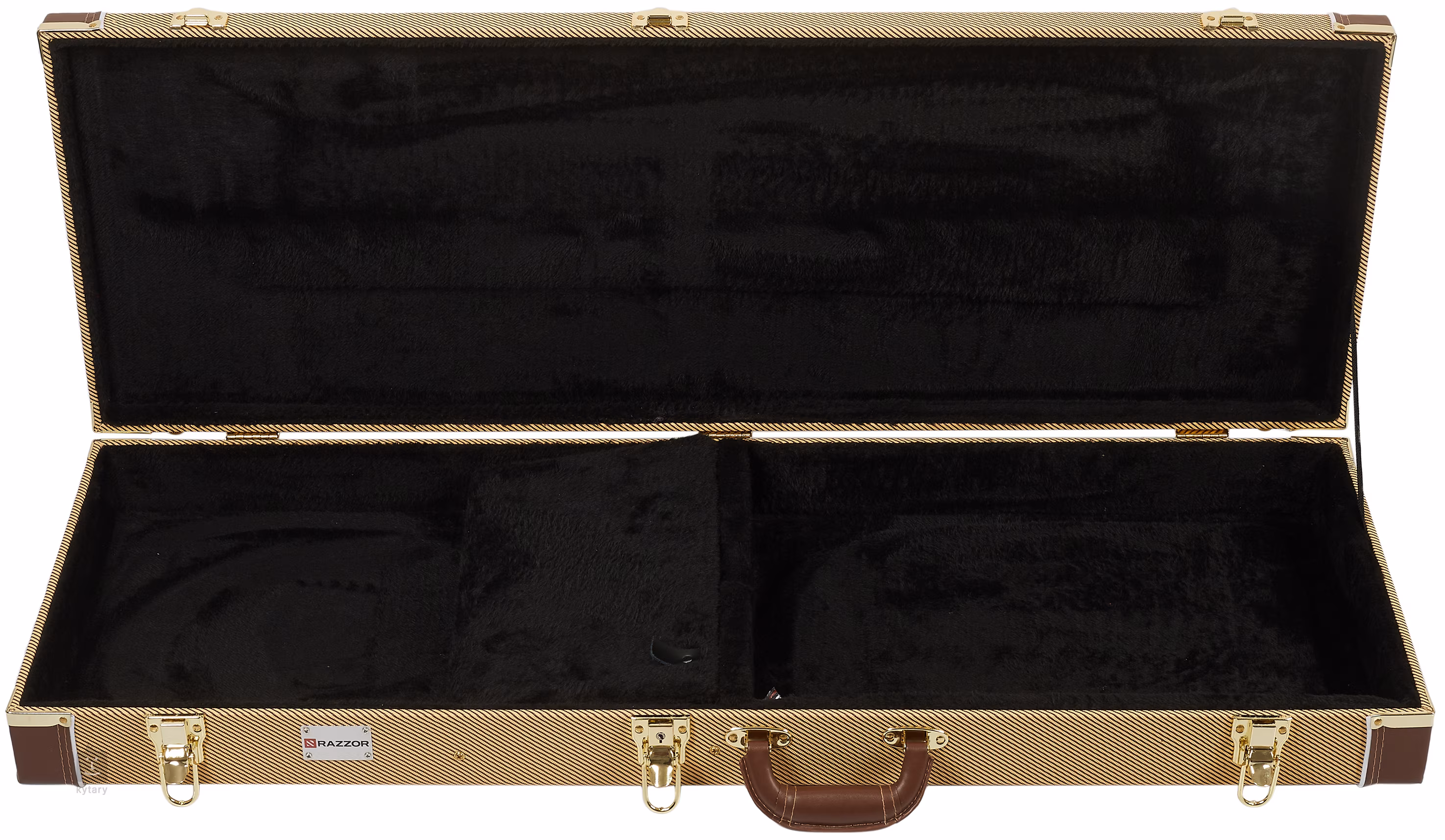 Kufry Razzor nabízí ve své cenové kategorii nadstandardní ochranu pro váš nástroj. Jsou vyrobeny z pětivrstvé překližky potažené tvídovým textilem, takže cenný náklad uvnitř jen tak něco neohrozí – ať je to špatné počasí, neodborná přeprava nebo nešikovní spoluhráči. Vnitřní fixace krku navíc drží nástroj ve stabilní poloze za všech okolností. Potěší také přihrádka na nejnutnější příslušenství a zámek na klíč.