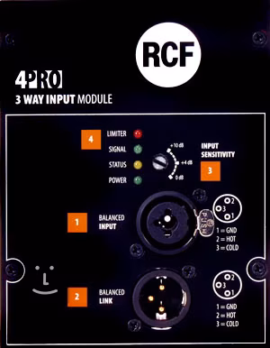 The input section presents a combo XLR/Jack line input connector,a recessed master volume and a useful XLR loop-through link.fhe processor section includes active crossover, system equalization, transducer phase alignment, limiter and protection functions.The system is visually monitored from 4 status LEDs.