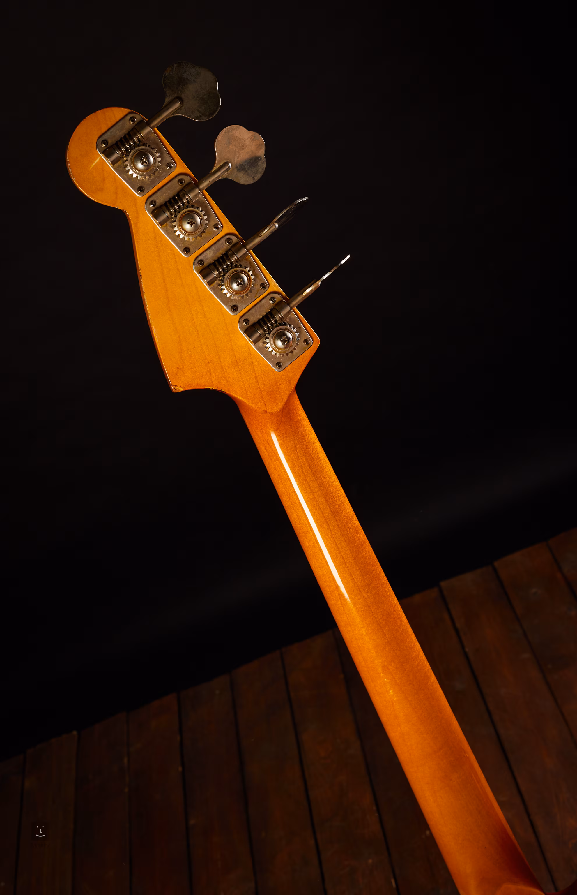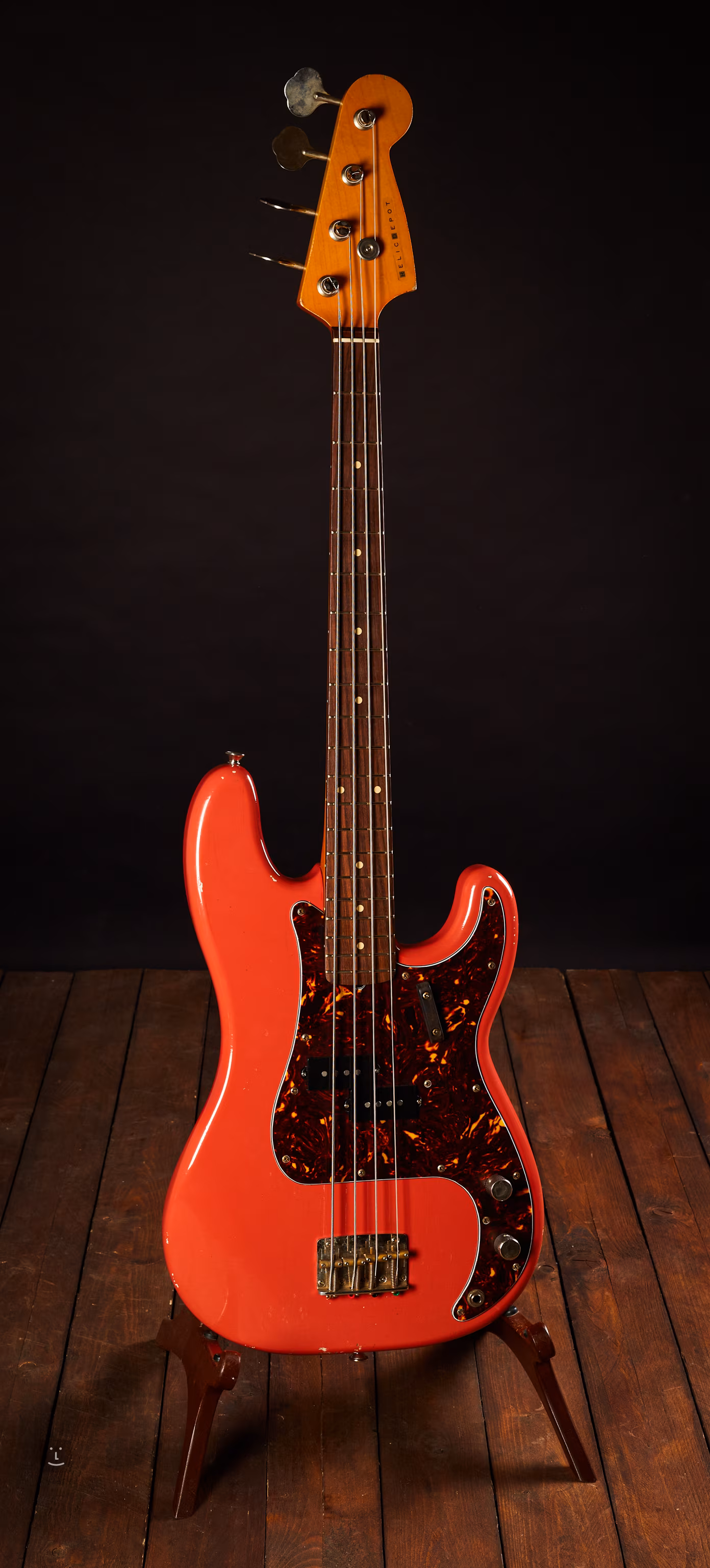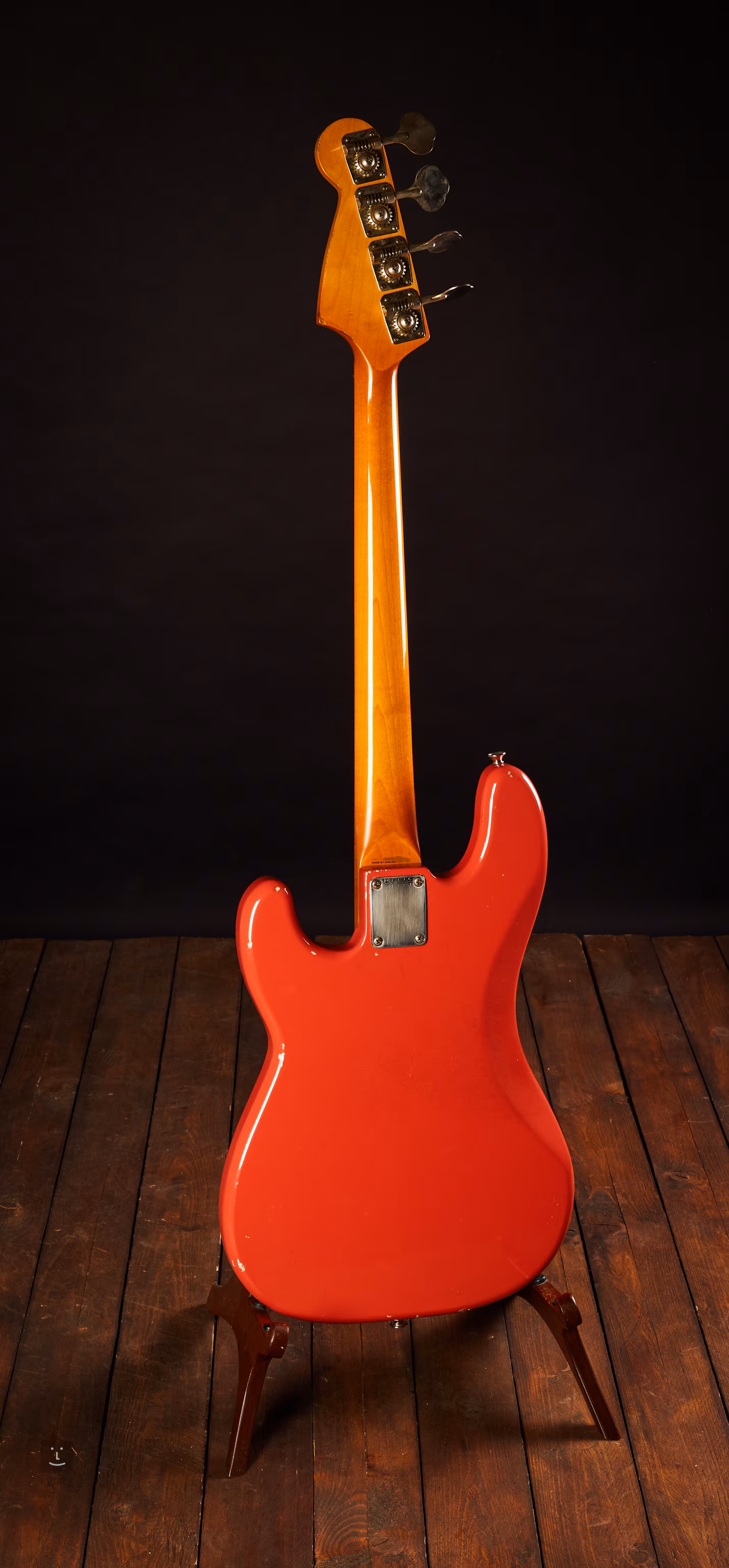 Short scale precision s tělem z borovice sibiřské. Jde o osobitý master-built nástroj v barvě Fiesta Red. Nástroj s příběhem.
