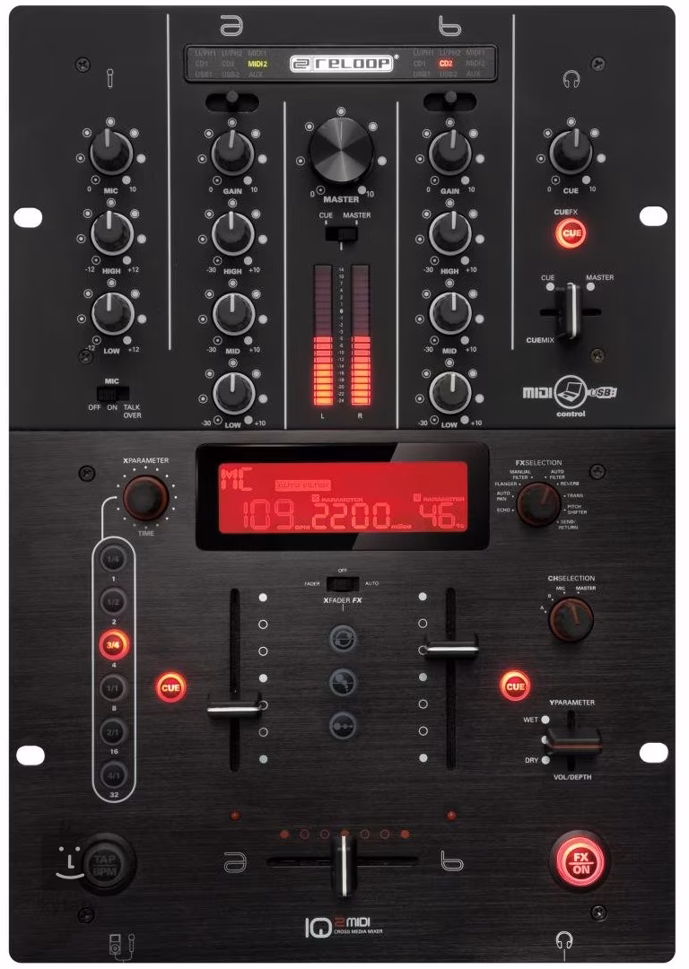 Profesionální dvoukanálový mixer IQ2 MIDI od firmy Reloop. Vyznačuje se perfektní zvukovou kvalitou s nízkým šumem. Obsahuje integrovanou zvukovou kartu s 24 bit/96 kHz studiovou kvalitou zvuku.
