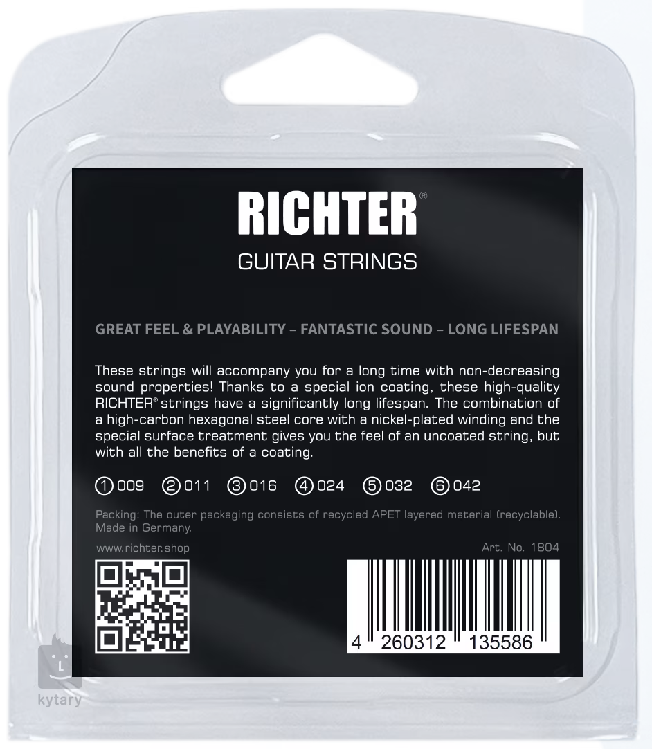 Struny známé společnosti Richter charakteristické svou výdrží, při zachování svých skvělých zvukových vlastností. Vysokým podílem karbonu v jádru v kombinaci s poniklovaným vinutím vytváří dojem nepotažených strun při všech výhodách potažení.