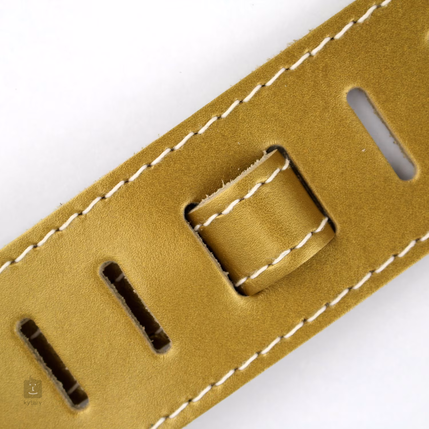 Exkluzivní kožený kytarový popruh. Šířka 6 centimetrů a tloušťka 3,5 - 4 milimetry nabídne dostatečné pohodlí i pří dlouhém hraní, originální design zajistí kontrastní prošívání na okrajích a zejména nezaměnitelná zlatá barva.
