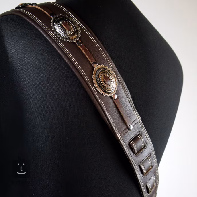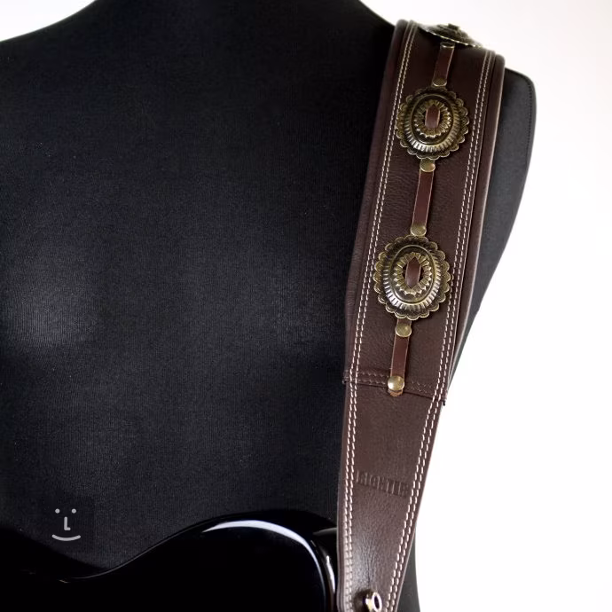 Exkluzivní kytarový popruh z italské kůže Nappa, která se používá k výrobě těch nejjemnějších rukavic. Šířka 7 centimetrů a 6 milimetrů silné polstrování po celé délce popruhu nabídne úlevu vašim zádům i při použití těch nejtěžších nástrojů. Speciální vyztužení kolem otvorů pro uchycení nástroje a dvojité prošívání garantují dlouhou životnost popruhu. Extra porci stylu popruhu dodávají ozdobné kovové plíšky v mosazné úpravě.