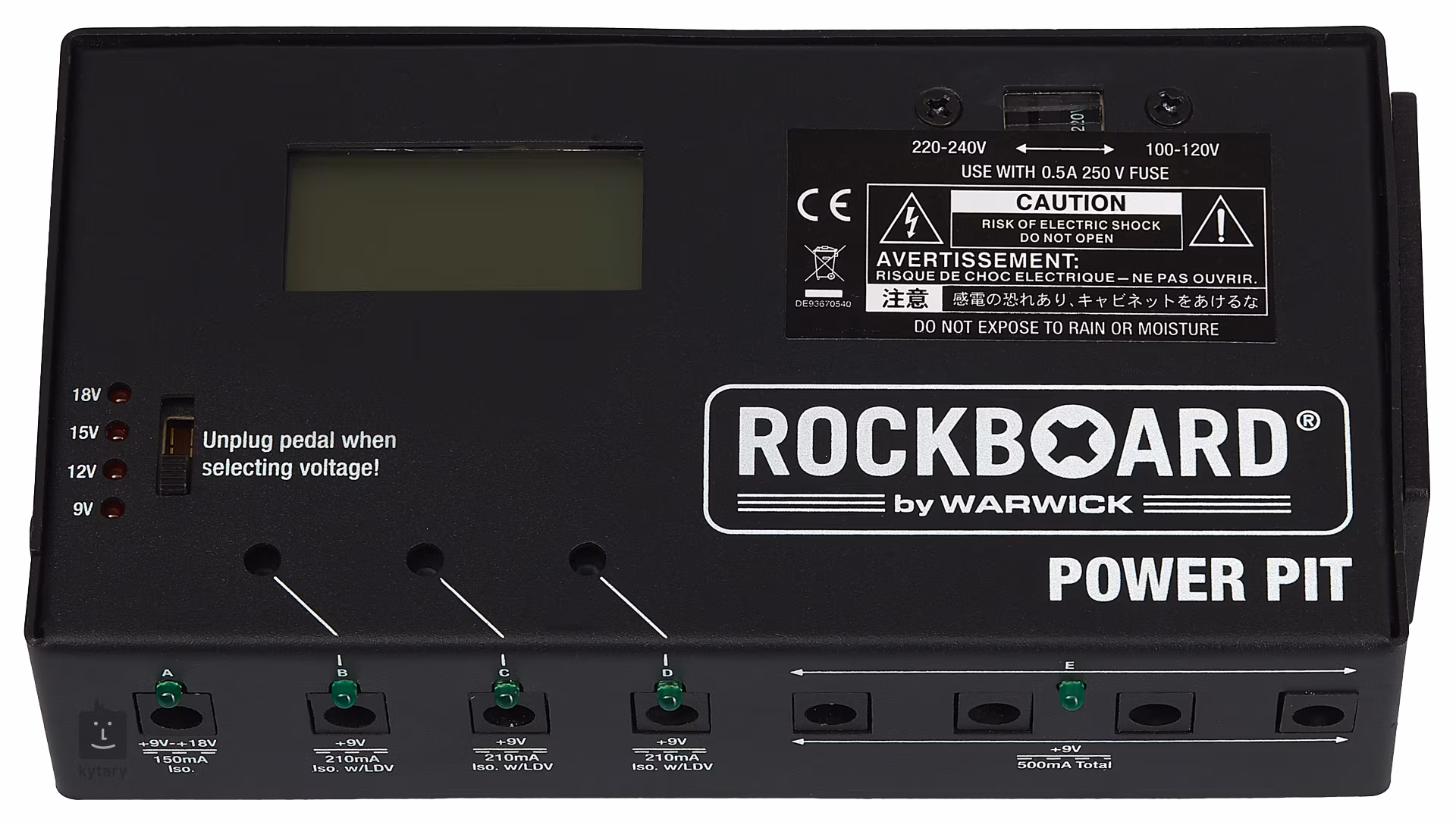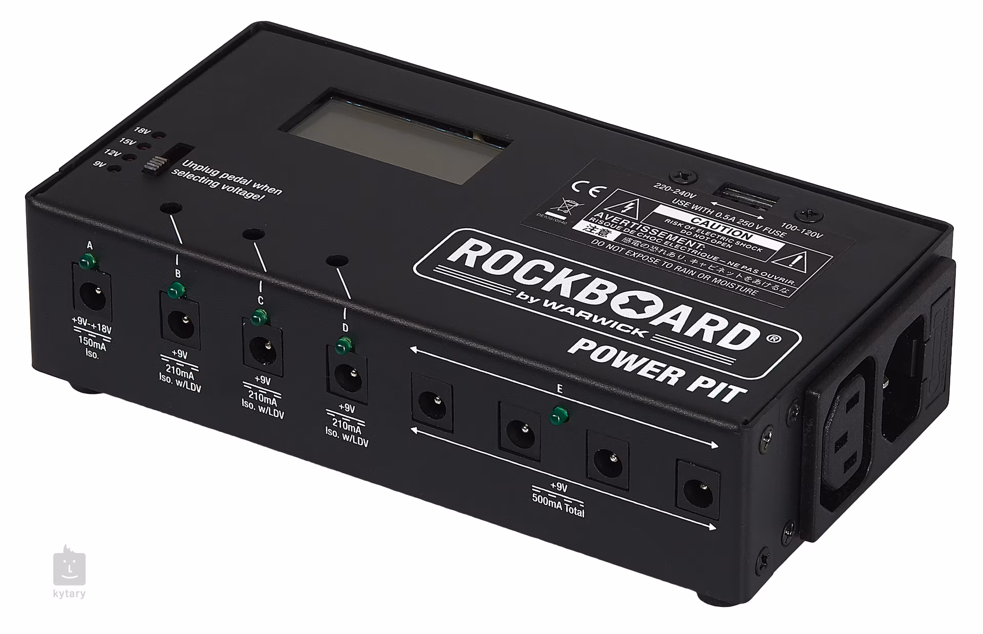 Rockboard Power Pit je všestranný multiadaptér k pedálovým efektům. Nabízí čtyři 9V výstupy s celkovou spotřebou 500 mA, tři výstupy s nastavitelným napětím (7,9 – 9,4V) a jeden výstup s možností volby 9, 12, 15, 18V napětí. Kromě vstupu pro síťový kabel nabízí i výstup k napájení dalších zařízení. Součástí balení je osm napájecích kabelů, síťový kabel, imbusový klíč k nastavení LDV a náhradní pojistky 4x 500 mA 250V.