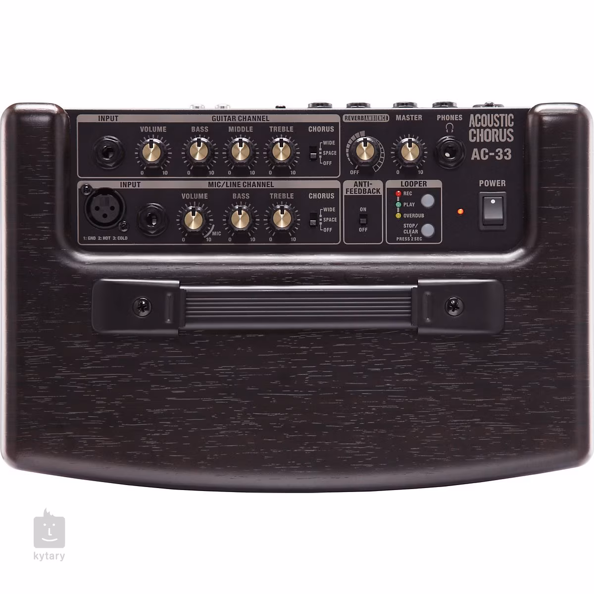 Ovladače jsou umístěny na horním panelu. Pro kytarový kanál je zde zabudován samozřejmě vstup, ovladač hlasitosti a pak také 3pásmový ekvalizér sestávající z Bass, Middle a Treble. Lze ze aktivovat stereo chorus, a to v módech Space nebo Wide. Mikrofonní kanál krom vstupu XLR obsahuje i 6,3 mm Jack linový vstup. I zde je ovladač hlasitosti a za ním tentokráte 2pásmový ekvalizér, tedy potenciometry Bass a Treble. I u tohoto kanálu lze zapnout chorus.