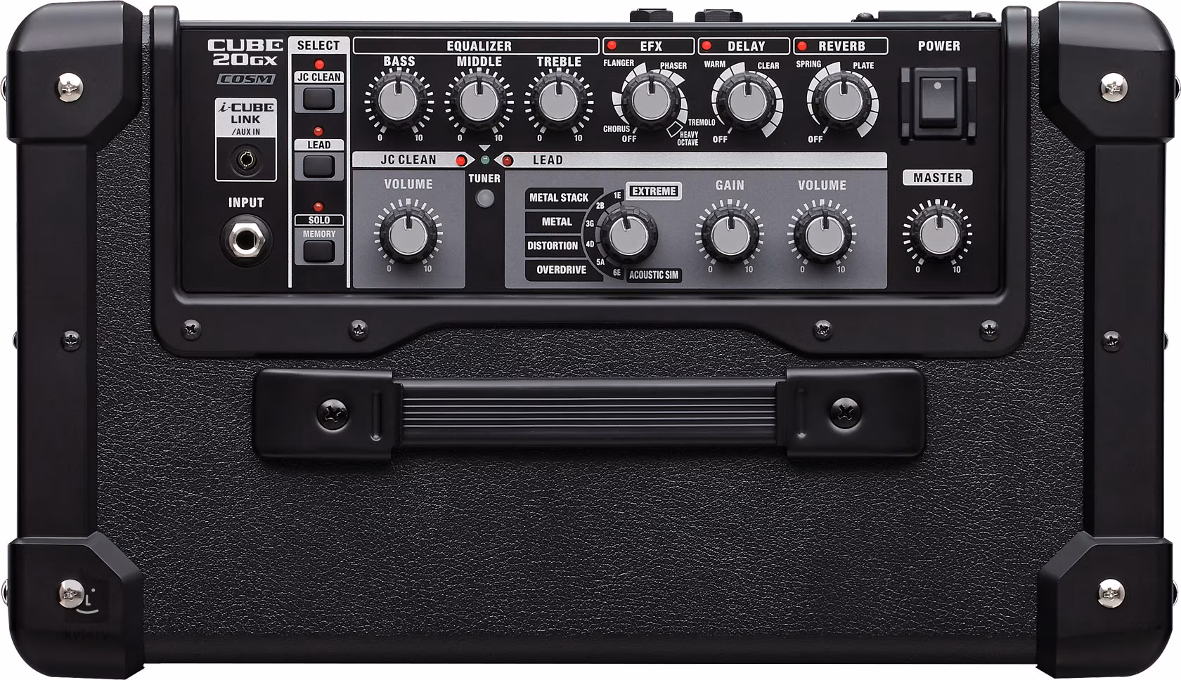 Potřebné prvky jsou umístěny na horním ovládacím panelu. V dolní řadě zde krom vstupu pro Vaši kytaru naleznete ovladač hlasitosti čistého kanálu, jenž je simulací legendárního Roland Jazz Chorus, přepínač mezi pěti módy zkresleného kanálu a simulací akustické kytary a potenciometry nastavující jeho zkreslení a hlasitost. Díky módům vycházejícím z legendárních kytarových zesilovačů či nejoblíbenějších zkreslení efektů firmy Boss nabízí Cube všechny zvuky od lehkého overdrive po pořádně hutný hi-gain.