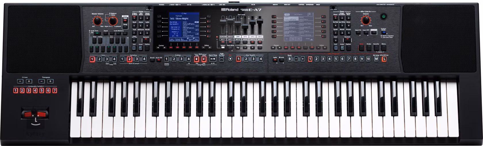 Jelikož má E-A7 spoustu tlačítek a sliderů, je většina ‘nepostradatelných’ úkonů ihned po ruce. Rovněž si můžete uložit různá nastavení současně s programem, včetně on/off stavu klíčových parametrů, jako Part, Auto Fill a Input EFX. Tyto mimořádné možnosti ovládání značí, že můžete snadno upravit nastavení keyboardu pro každý song už během vystoupení. Programy z řady BK aranžérů Roland jsou rovněž přímo přístupné z USB flash disku.