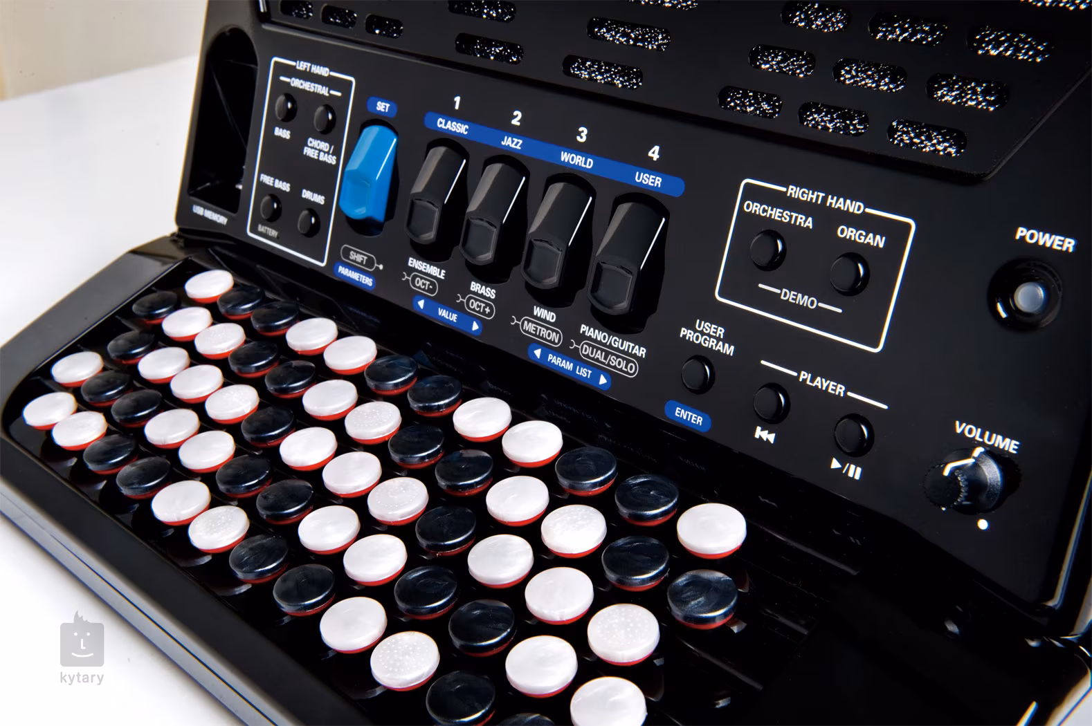 V-Accordion má na svědomí revoluci v hudebním světě a Roland určil sám sebe za vývojáře těchto skvělých nástrojů. Řada FR-1x je nejnovějším přírůstkem slavné rodiny V-Accordion. Tyto kompaktní lehké modely nabízejí stejnou flexibilitu a přenositelnost jako jejich populární předchůdce FR-1, ovšem přidávají další významné vlastnosti včetně USB funkcí a vyspělého ovládání tlakových měchů, zaručující mimořádnou citlivost a přesnost. S novou generací zabudovaných reproduktorů a větším 7-segmentovým/3-znakovým displejem nastavuje pianový typ FR-1x Piano a tlačítkový typ FR-1x Button nový standard malých a lehkých akordeonů.