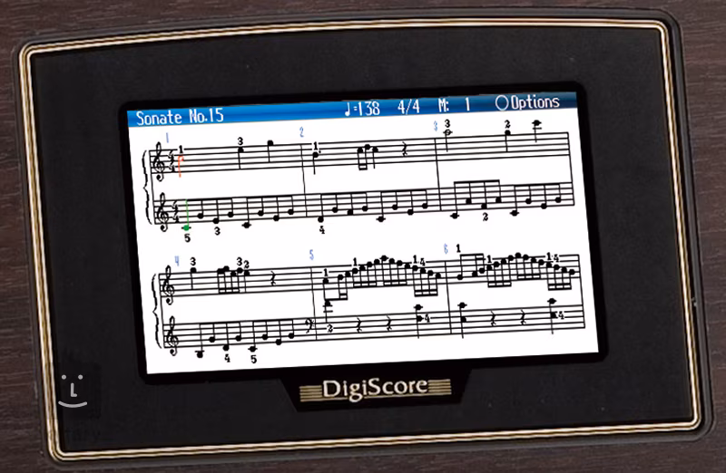 DigiScore zobrazuje digitální notovou partituru na velkém LCD. Vylepšete své herní schopnosti cvičebními programy Visual Lessons a Finger-Training, a hrajte podle rytmického pohybu koulí a hudby, výrazně tím zlepšíte svůj cit pro rytmus. DigiScore rovněž zobrazuje očíslované prsty, noty i jména akordů, dále hudební symboly a notační značky, snadno přepínáte na rozšířené a detailní zobrazení partů každé ruky. Můžete také hrát podle grafického metronomu či klaviatury na displeji, a vizuálně tak kontrolovat, jakou silou který prst uhodil.