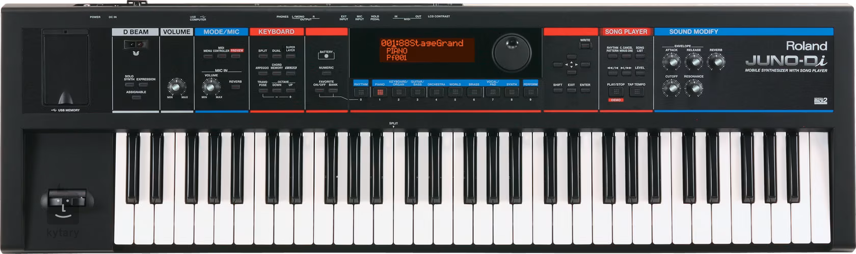 Na podiu i v ulicích, JUNO-Di je snem hudebníků na cestách. Je lehký, praktický a k napájení vám stačí třeba jen baterie. Je vybavený širokou paletou těch nejlepších zvuků - na výběr máte více než 1000 zvuků! Je vybavený praktickým ovládacím panelemm "direct access", s kterým zvládnete úpravy levou zadní a též prehrávačem skladeb. Tento přenosný a skvěle hrající syntetizátor si oblíbí jak profesionálové, tak i začátečníci.