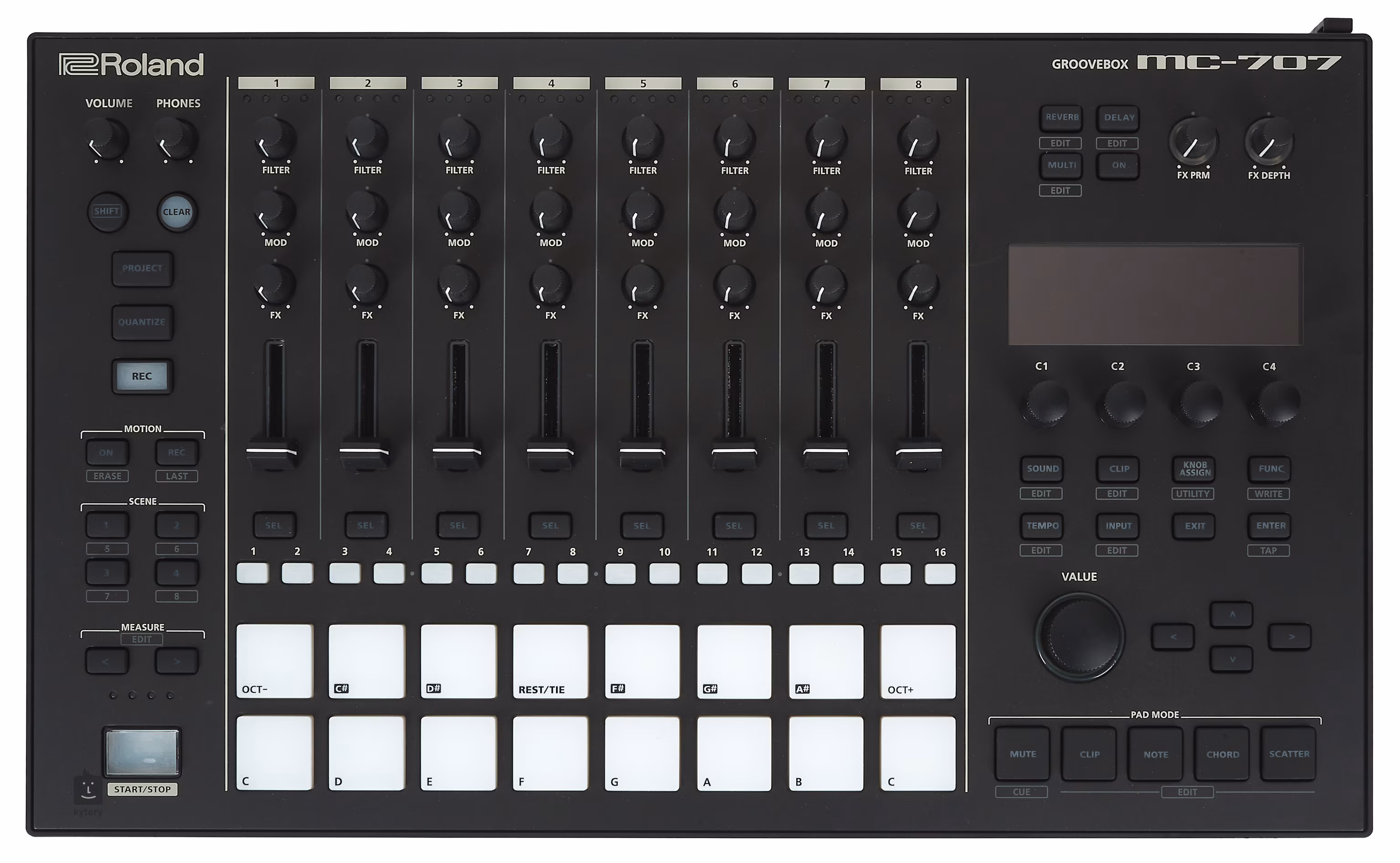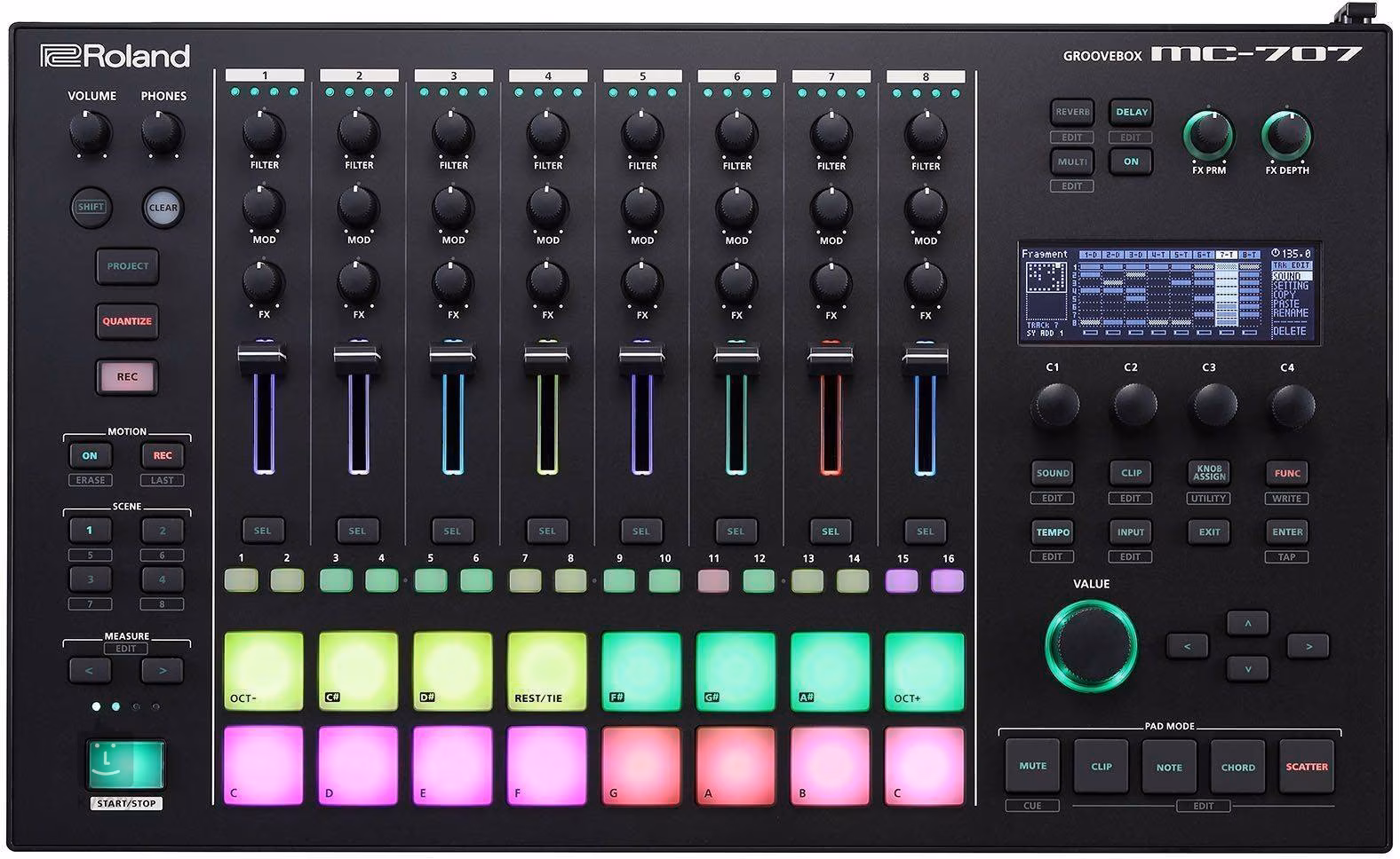 Osm stop sekvencování založeného na klipech. Osmistopý sekvencer MC-707 je optimalizovaný pro produkci moderních elektronických stylů a neustále se vyvíjejících žánrů. Krokový sekvencer TR-REC je ten samý, který najdete v klasických bicích automatech Roland a který je dokonalý pro rychlé vystavění rytmu. K dispozici máte také 16 ultracitlivých padů pro hraní či sekvencování bicích, melodických basů či polyfonních sledů akordů. Klipy sekvenceru dokonce spolu s notami ukládají i pohyby vašich ovladačů. To vám dovoluje vytvářet dramatické, dynamické efekty jako hluboký Reverb s jediným tlesknutím, pomalé přechody s filtry a mnohem více.